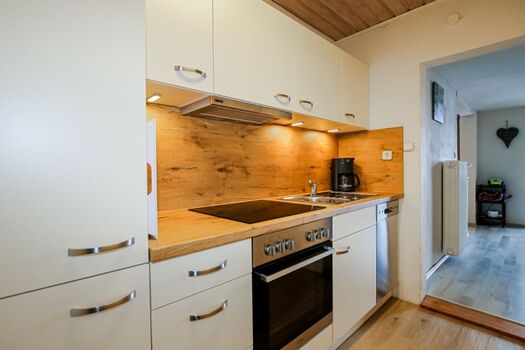4-Platten Herd, Dunstabzugshaube, Kühlschrank mit Gefrierfach, Korkenzieher / Flaschenöffner, Geschirrhandtücher