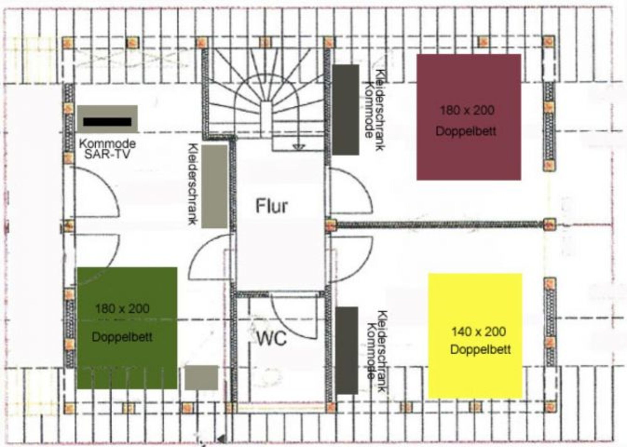 Doppelbett 1,40 x 2,00m, Kommode, Leselampe am Bett, Fliegengitter