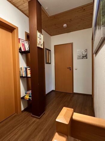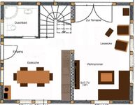 Das Haus besteht aus einem großen Wohnbereich im Erdgeschoss. Dort befindet sich auch die Küche mit dem großen Eßtisch. Dusche und WC mit Fußbodenheizung runden das EG ab. Eine geschwungene Holztreppe führt in den ersten Stock. Dort finden Sie drei Schlafzimmer, ein Gäste-WC und eine großes Regal mit Büchern und Spielen. Vom Wohnbereich aus kommen Sie durch eine große Tür auf die Terasse.