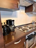 4-Platten Herd, Kühlschrank mit Gefrierfach, Senseo-Kaffeeautomat, Eierkocher, Korkenzieher / Flaschenöffner, Geschirrhandtücher, Mülltüten, Essplatz in der Küche