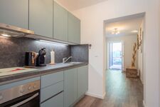 4-Platten Herd, Cerankochfeld, Dunstabzugshaube, Kühlschrank mit Gefrierfach, Tassimo-Kaffeautomat, Korkenzieher / Flaschenöffner, Geschirrhandtücher
