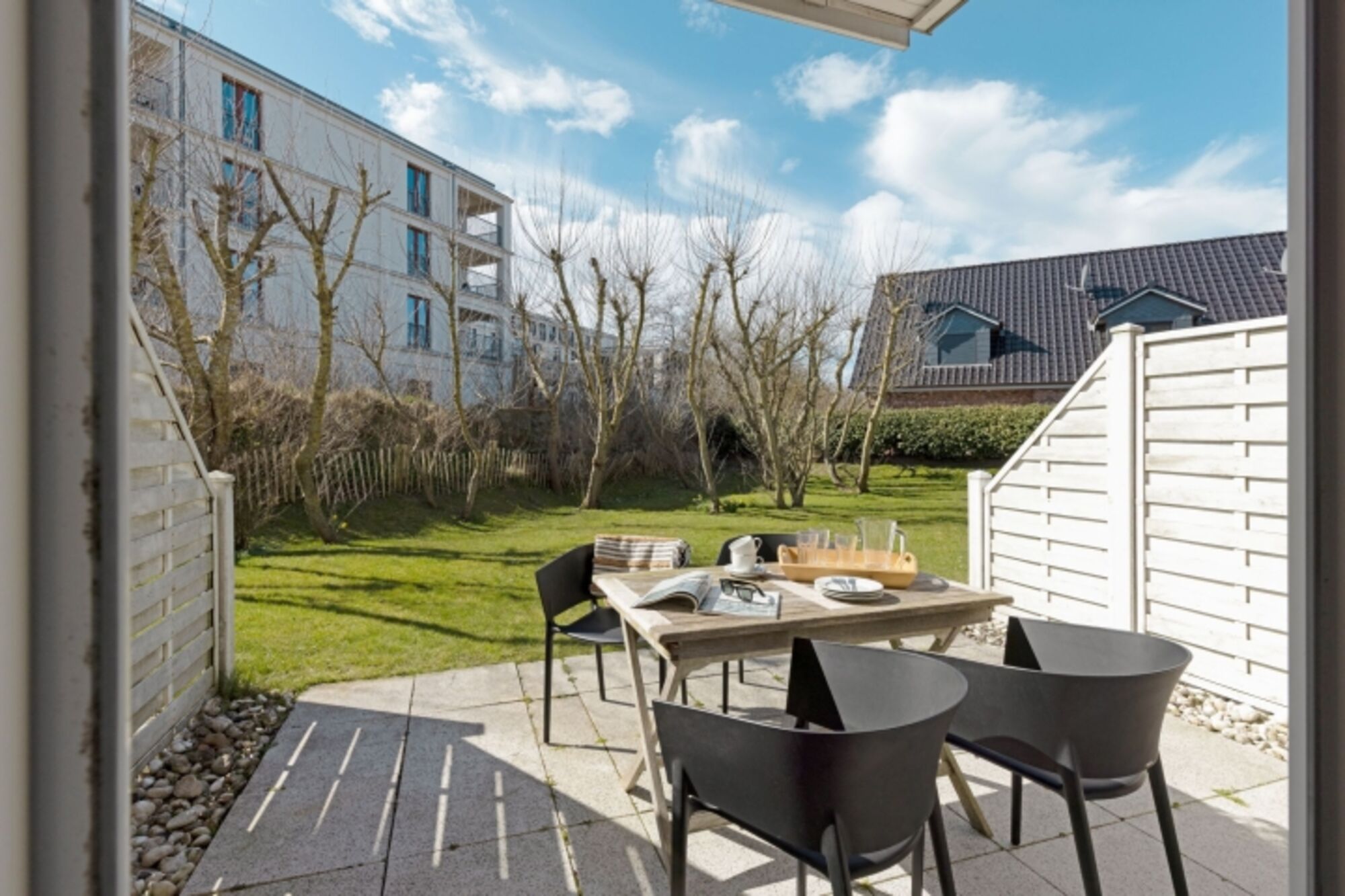 Helles Appartement mit kleiner Terrasse und Strandkorb im Erdgeschoss