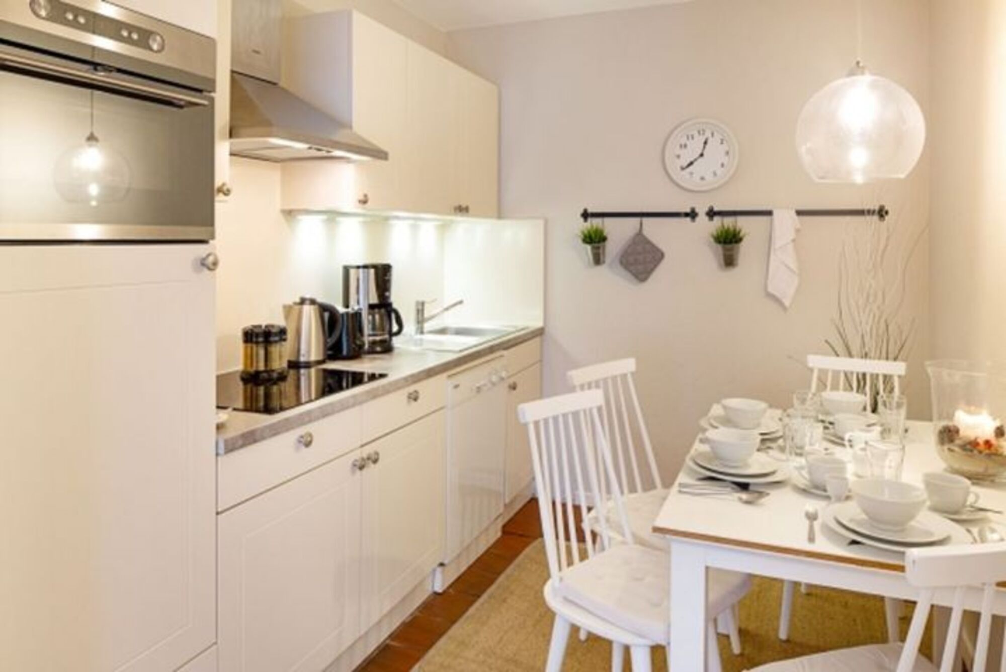 Cerankochfeld, Dunstabzugshaube, Kühlschrank mit Gefrierfach, Nespresso-Automat, Korkenzieher / Flaschenöffner, Essplatz in der Küche