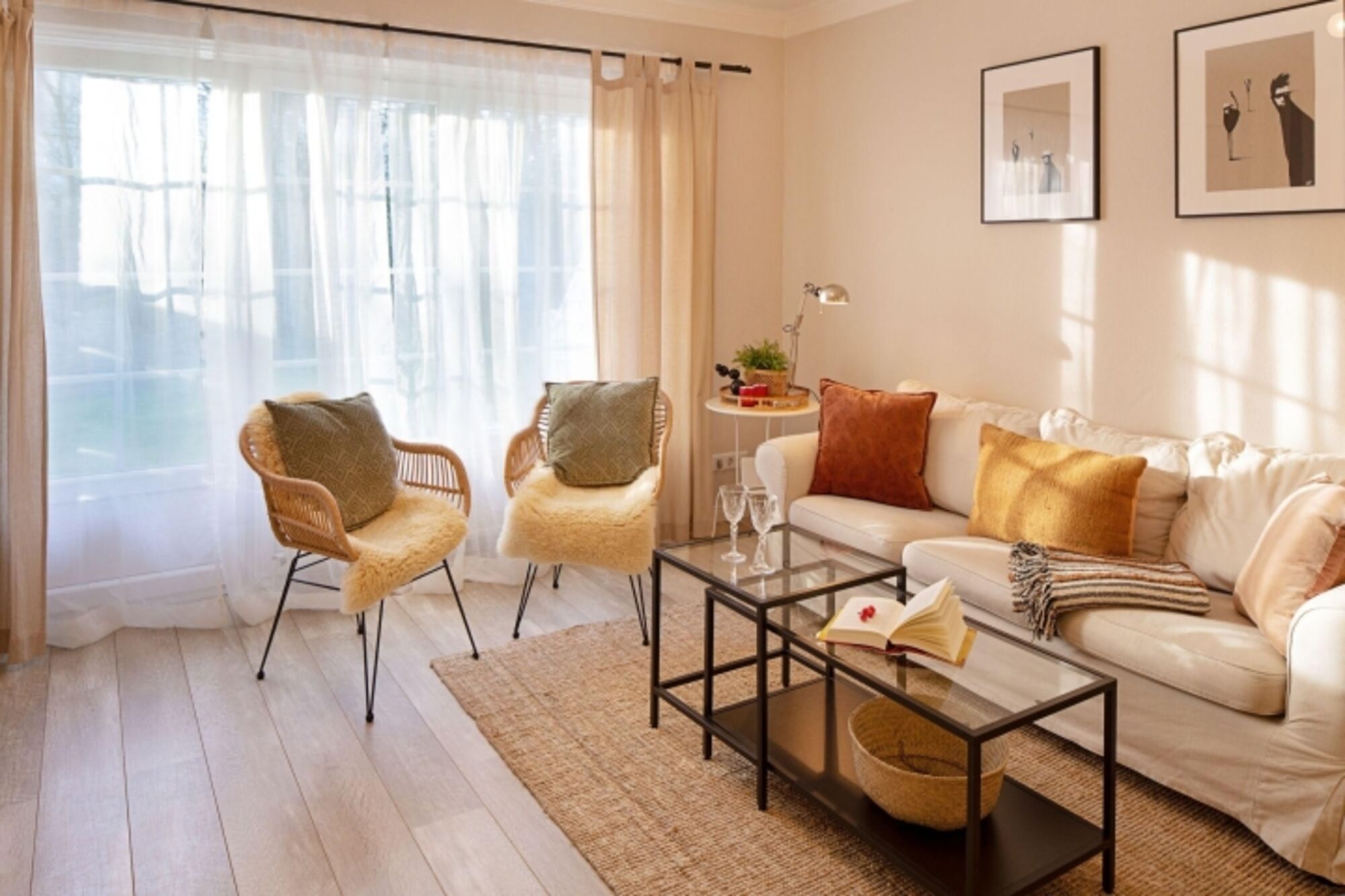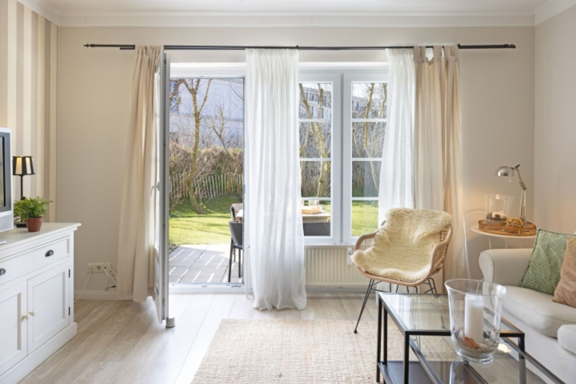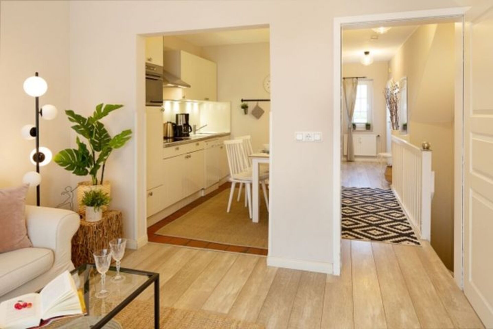 Borlis Perle besticht durch eine stilvolle Einrichtung und eine Sonnenterrasse mit Strandkorb (von Ostern bis Oktober). Das helle Wohnzimmer mit Blick ins Grüne lädt zum Entspannen ein. Hier kann man richtig abschalten! Die gut ausgestattete Küche mit Esstisch bietet Ihnen alles, was Sie brauchen. Eine Nespresso-Maschine ist selbstverständlich vorhanden.