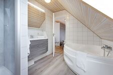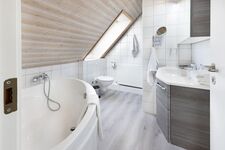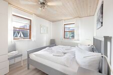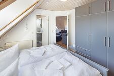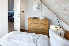Eine offene Treppe führt ins 1.OG. Hier befindet sich ein weiteres Bad mit Wanne und zwei Schlafzimmer, jeweils mit Doppelbetten.