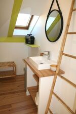 Schlafzimmer mit Doppelbett. Schlafzimmer mit Einzelbett. Badezimmer mit ebenerdiger Dusche (Regenwalddusche), Waschbecken. Sep. WC. Teilweise Dachschräge.