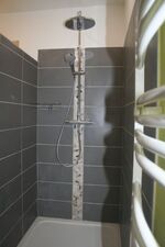 Waschbecken, Regendusche, Spiegel, Fenster im Bad
