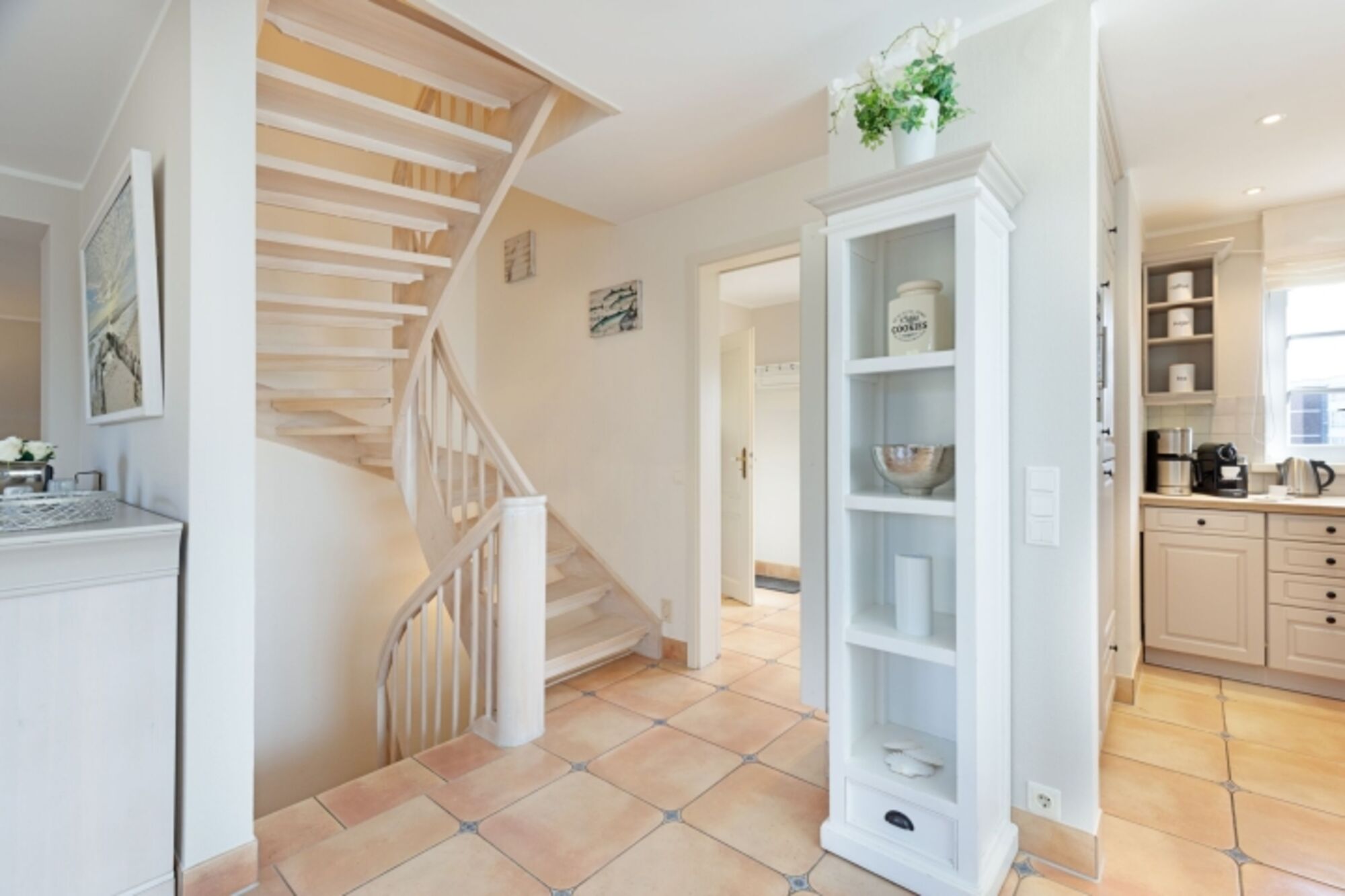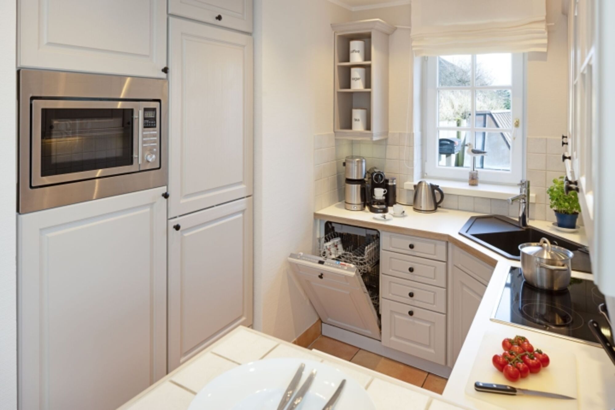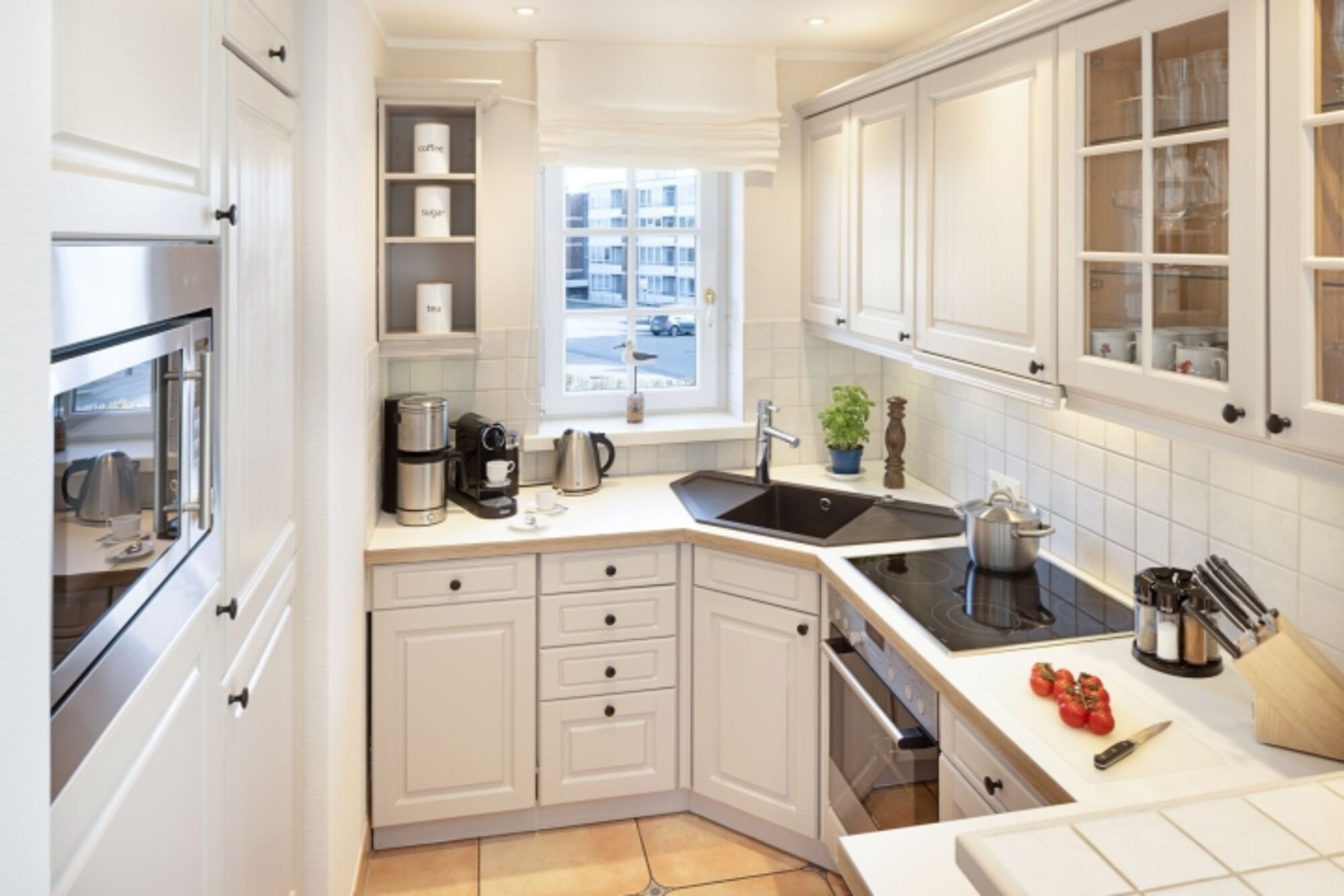 Cerankochfeld, Kühlschrank mit Gefrierfach, Nespresso-Automat, Mixer, Korkenzieher / Flaschenöffner, Gewürze (Salz, Pfeffer, Zucker)
