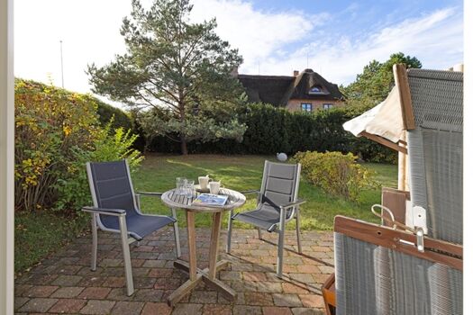 Helles Appartement mit kleiner Terrasse und Strandkorb im Erdgeschoss