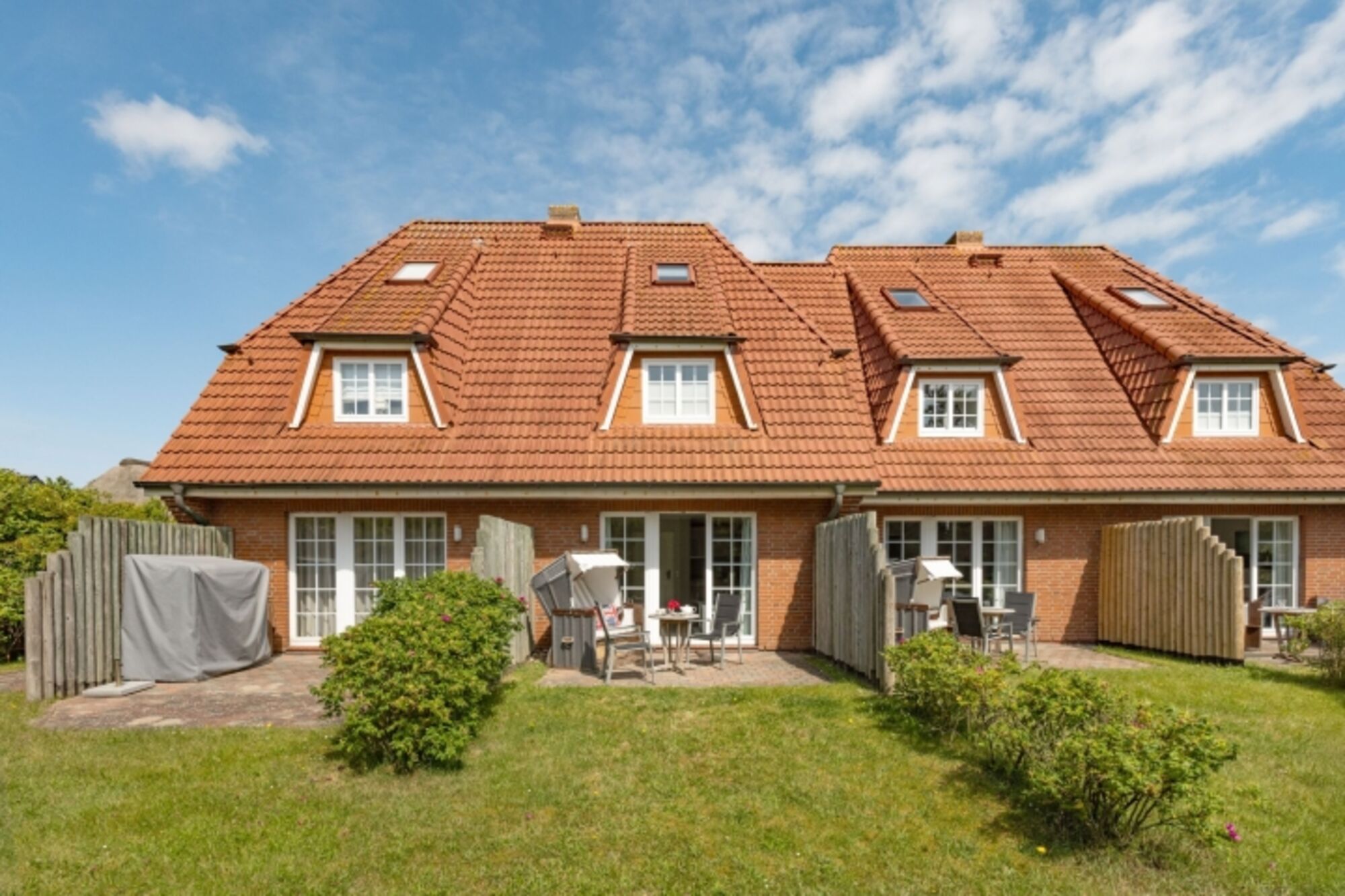 Modernes Ferienreihenhaus unter Reet mit Kamin und großem Garten
