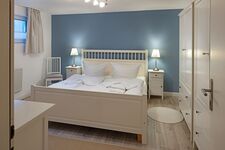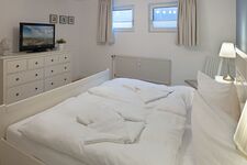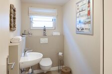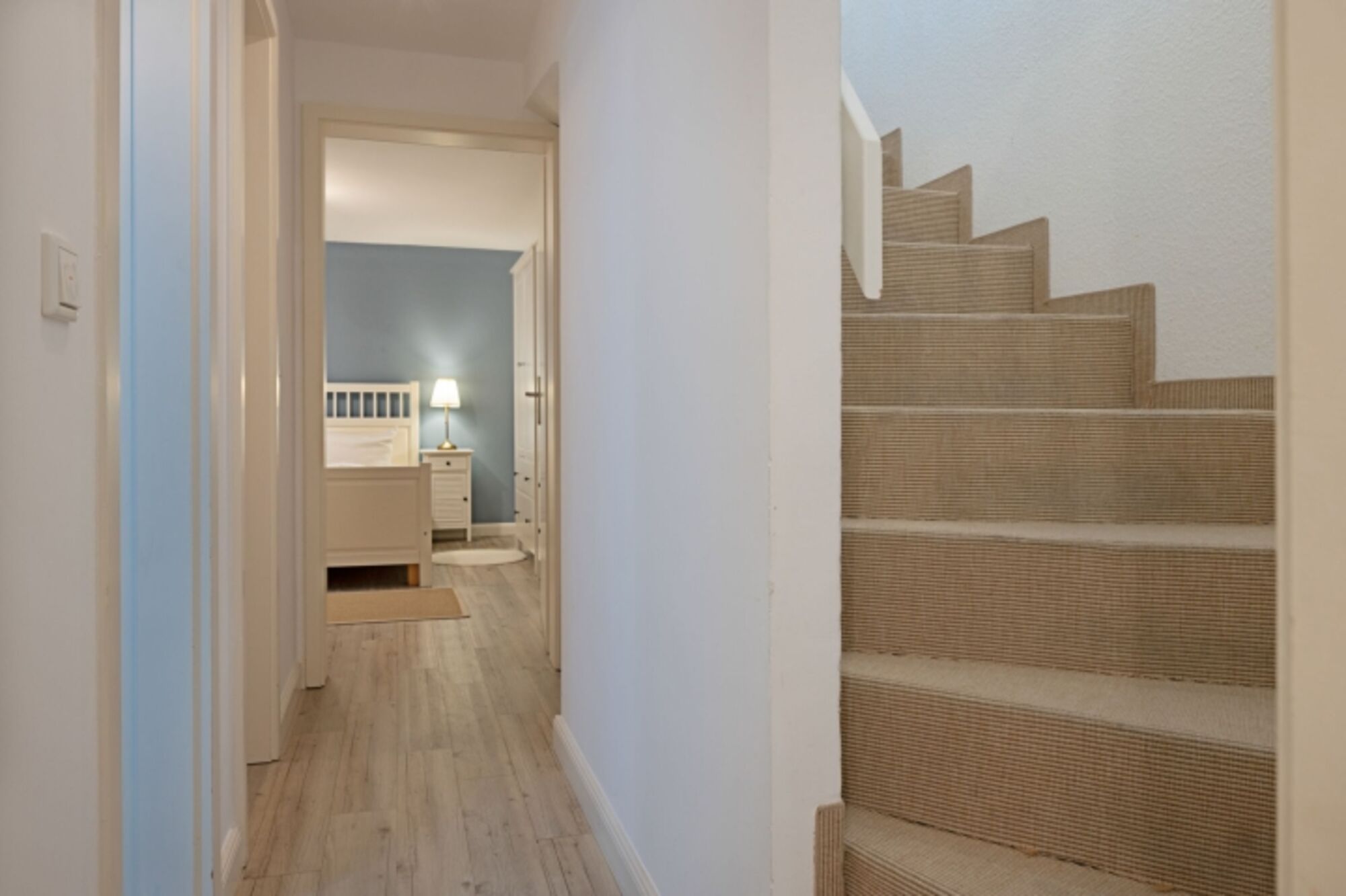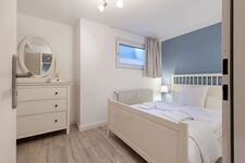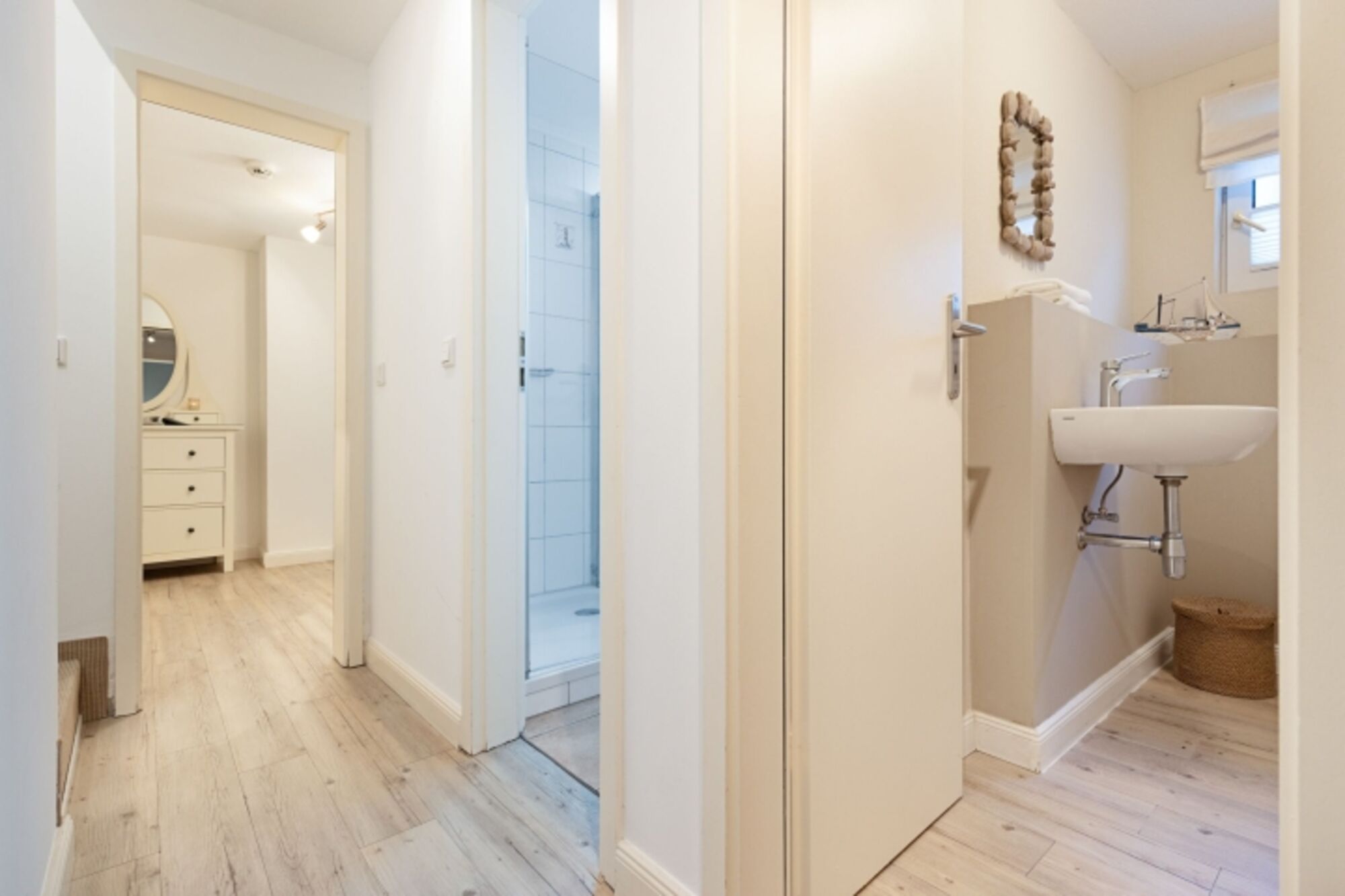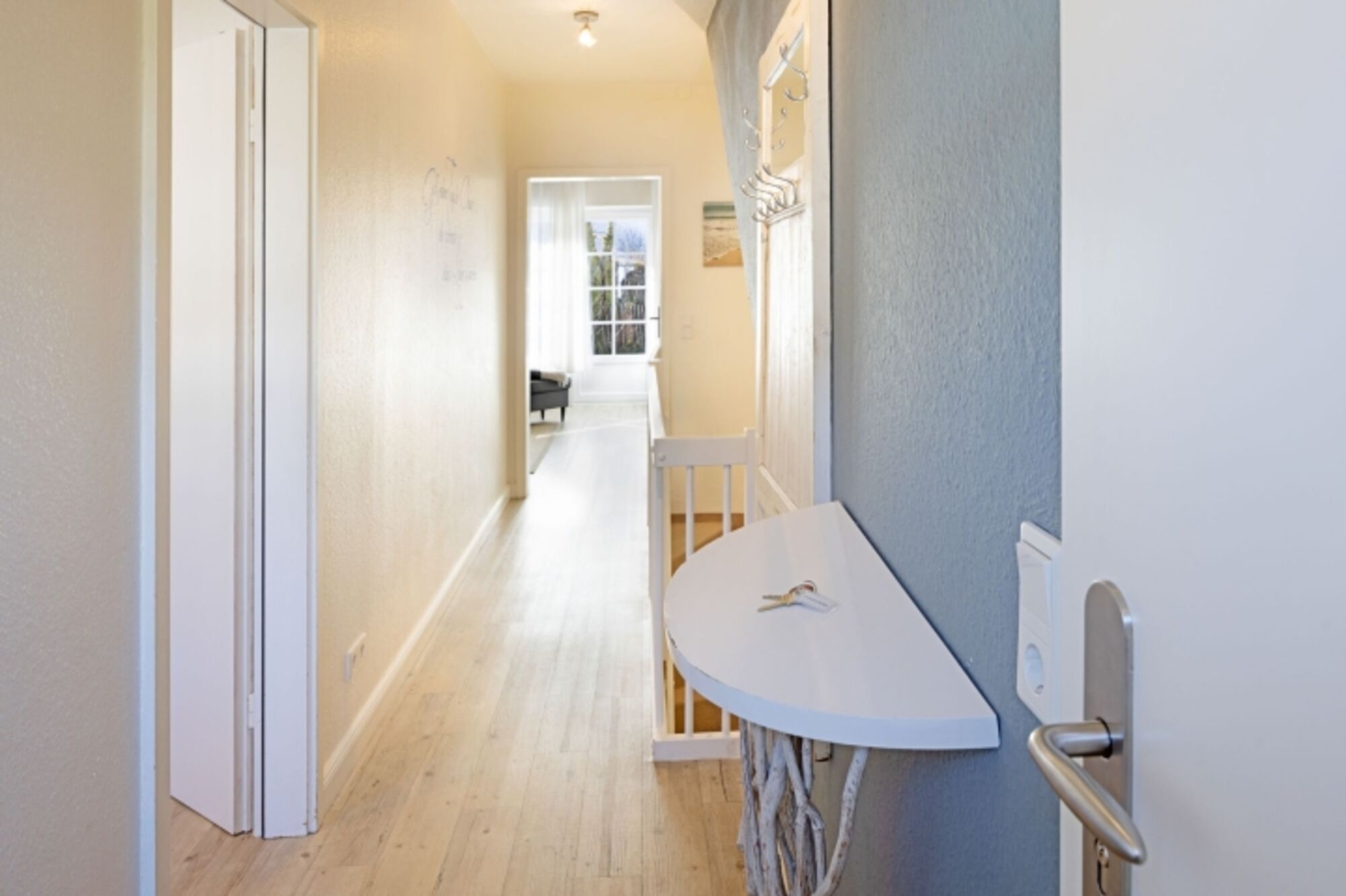 Auf der mit Holzmöbeln ausgestatteten Terrasse finden Sie auch einen Strandkorb. Der hübsch gestaltete Flur führt nach unten, wo Sie zwei weitere Schlafzimmer finden, die jeweils mit Doppelbetten ausgestattet sind. Auch das Badezimmer und ein zusätzliches Gäste-WC finden Sie in dieser Ebene.
