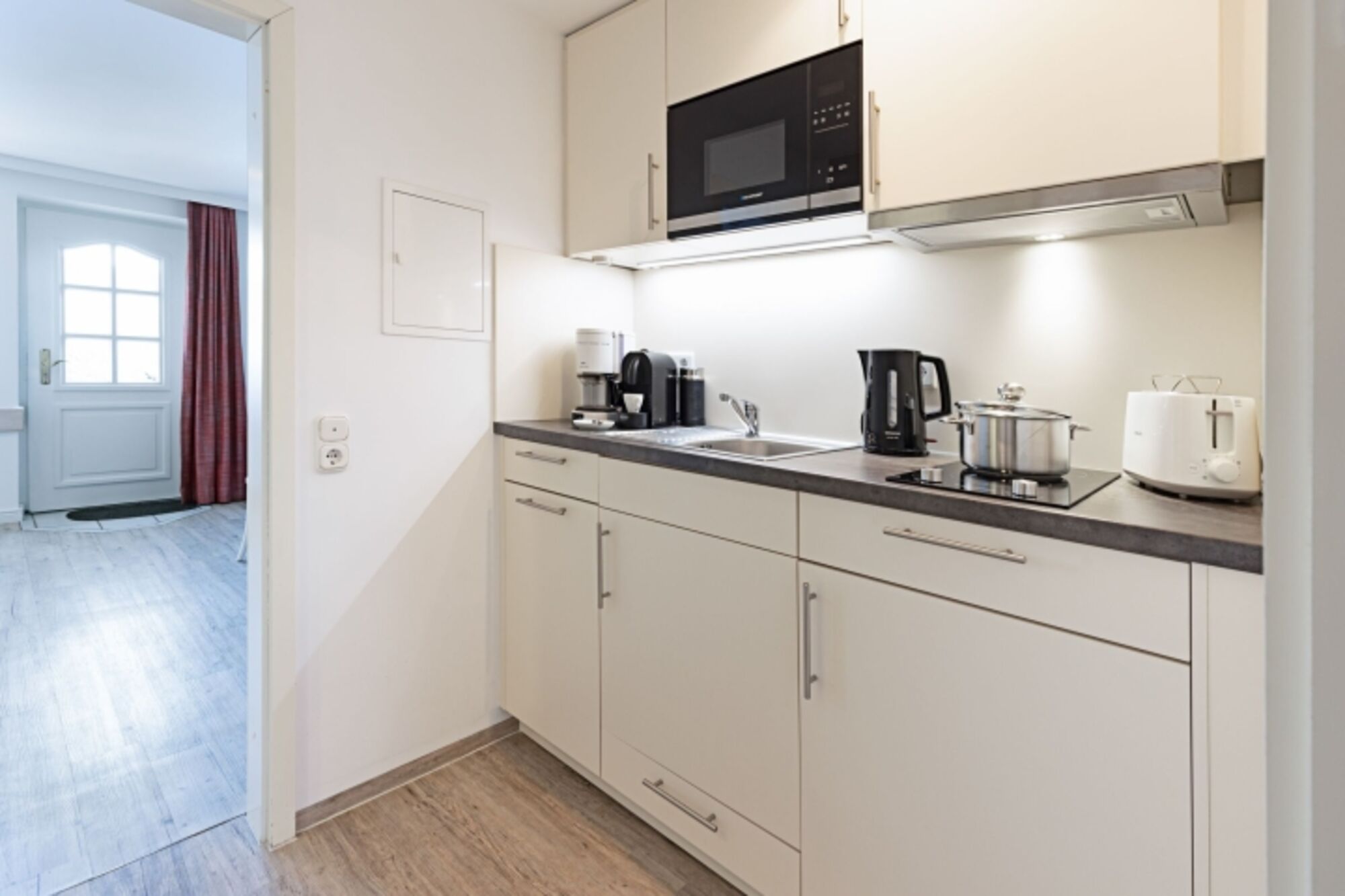 Ein Wohnzimmer, ein kleiner Essplatz und einen Küchenzeile stehen zur Verfügung.