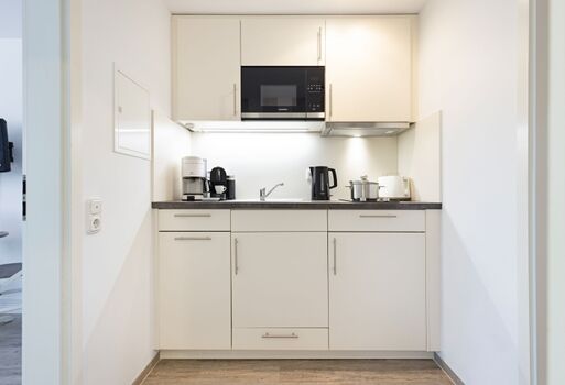 In der Wohnung befindet sich eine Pantry-Küche sowie ein Duschbad. Waschmaschine und Trockner sind gegen Gebühr nutzbar.