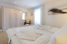 Das Schlafzimmer (Doppelbett) mit hellen Möbeln lädt zu geruhsamen Nächten ein.