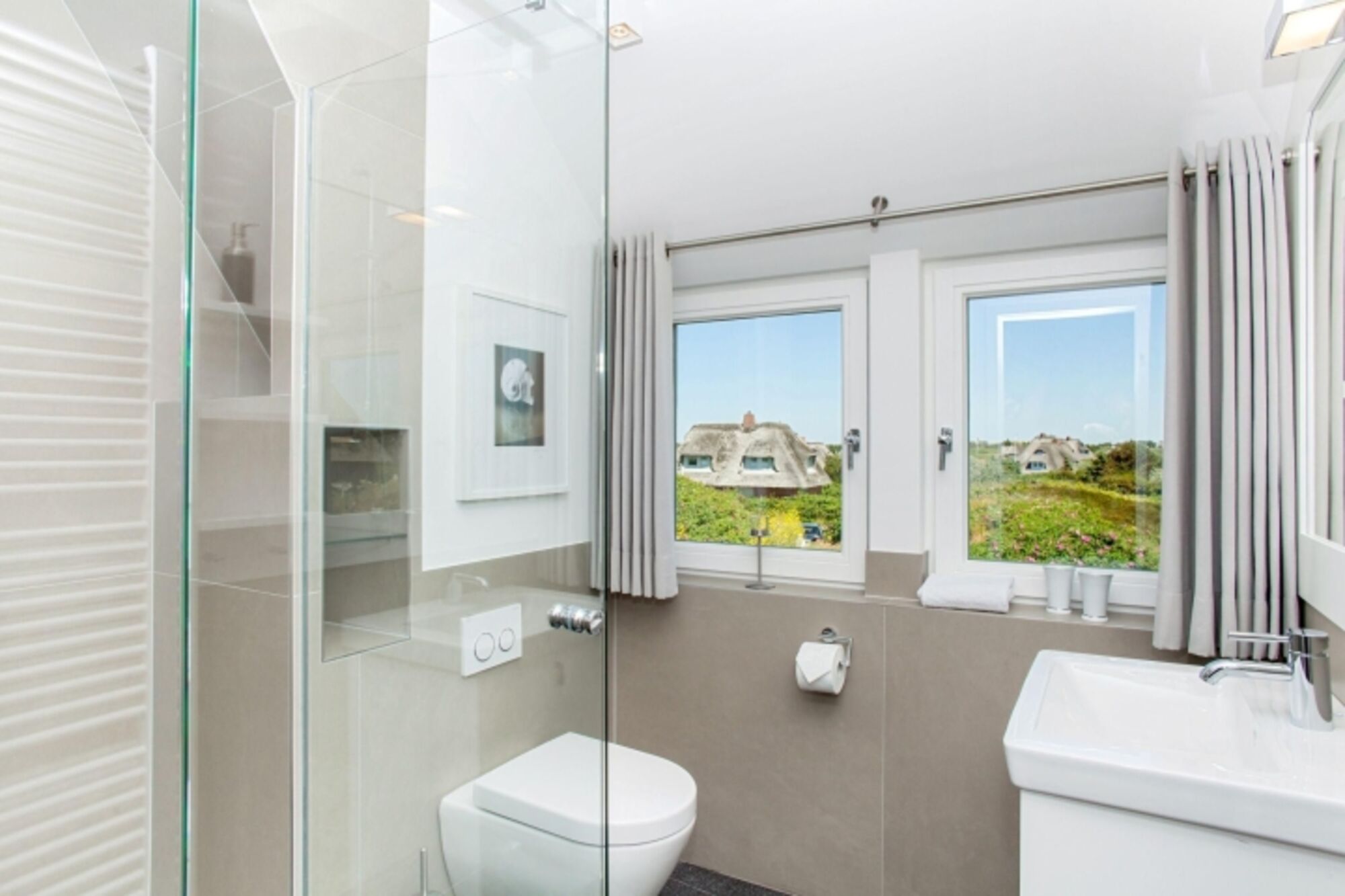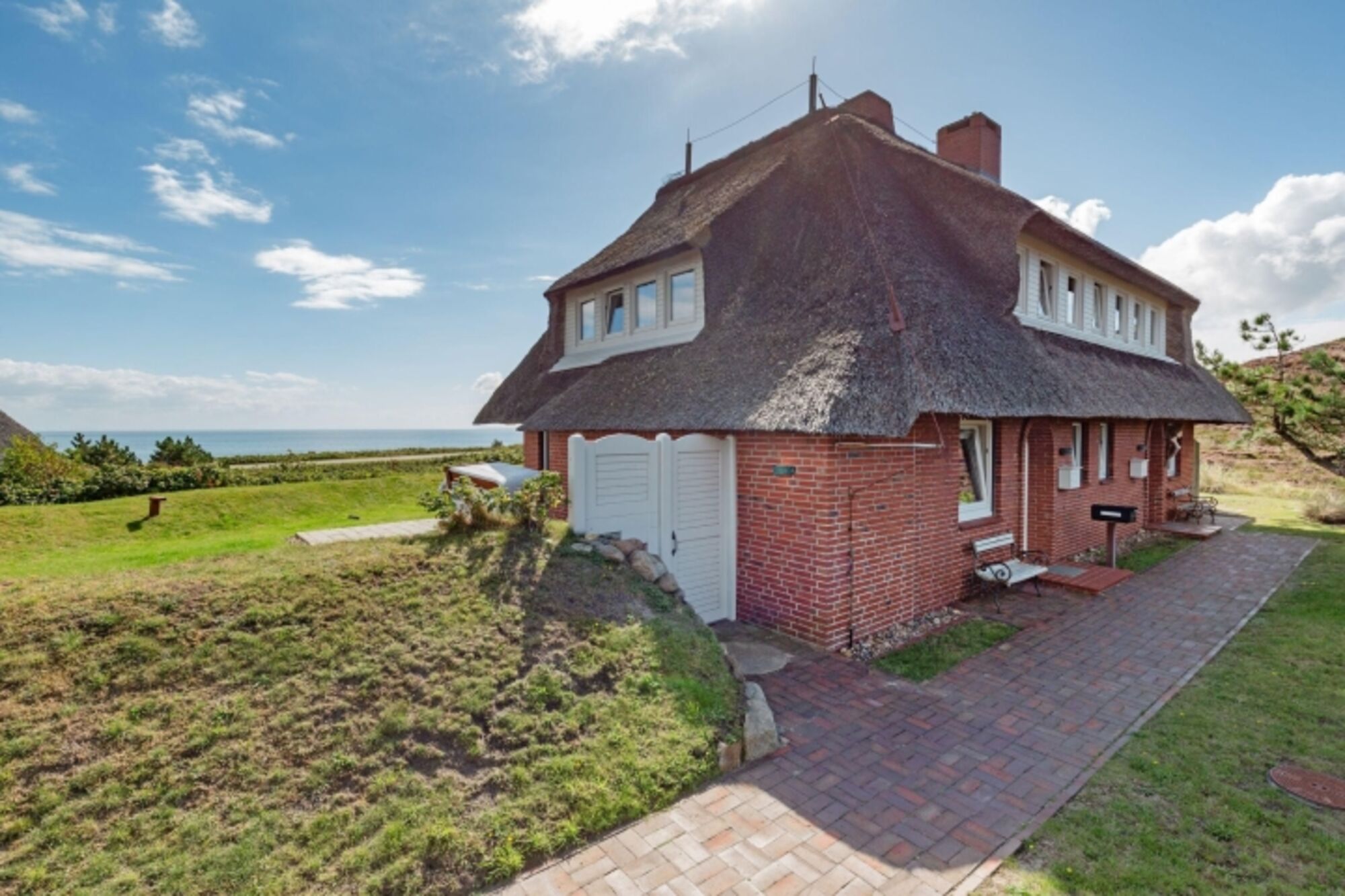 Modernes Feriendoppelhaus unter Reet mit unverbautem Meerblick