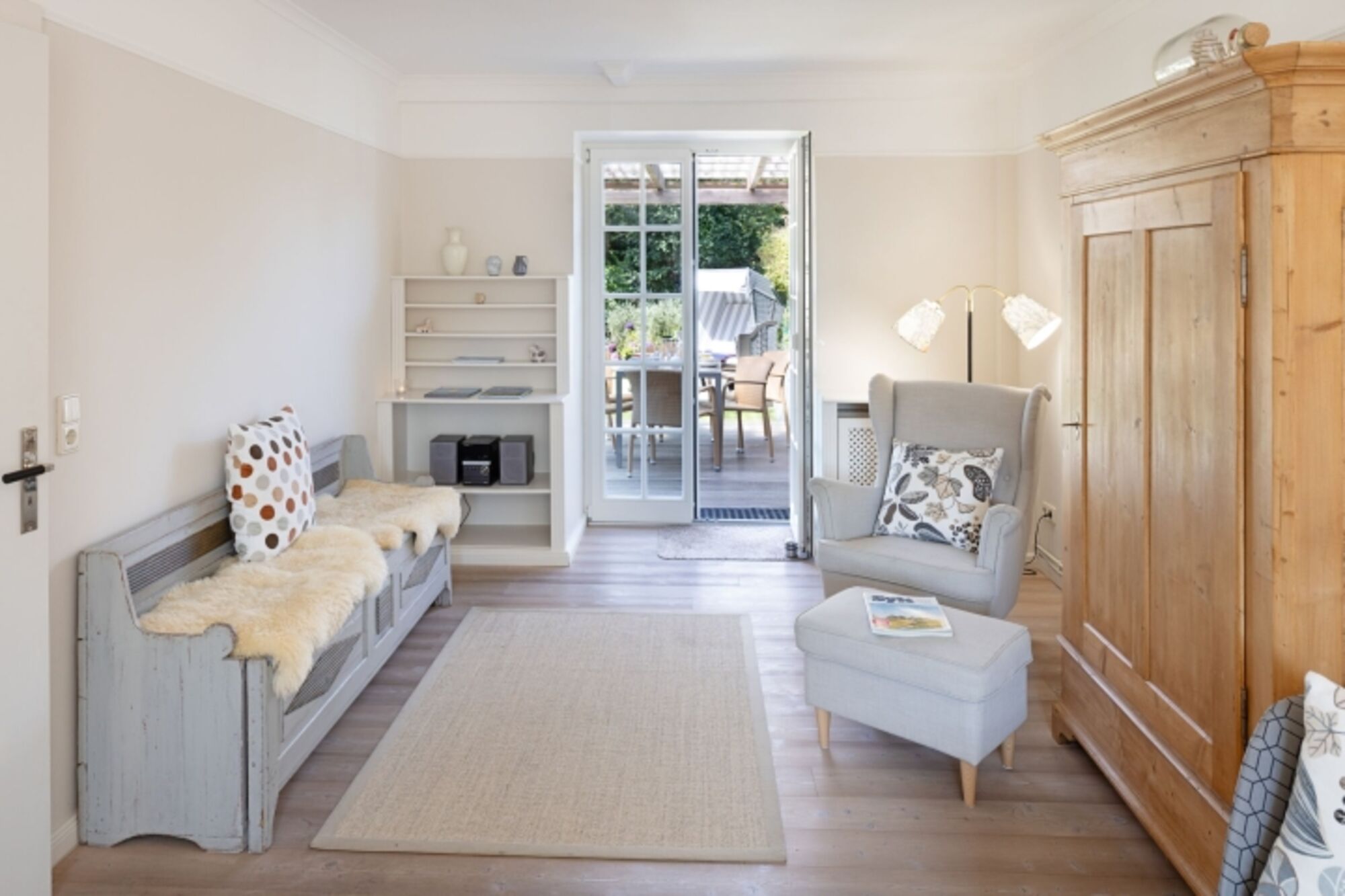 Helles Appartement mit kleiner Terrasse und Strandkorb im Erdgeschoss