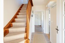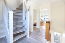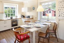 Das individuell eingerichtete Ferienreihenhaus ist mit Holzfußböden ausgestattet und verfügt über ein Schlafzimmer mit Doppelbett, ein Schlafzimmer mit drei Einzelbetten und einem Schlafzimmer mit zwei Einzelbetten. Zwei Badezimmer mit Dusche und ein Gäste-WC, sowie die große Küche mit guter Ausstattung. Sie haben einen eigenen Garten mit großer Liegewiese und Strandkorb und eine überdachte Terrasse. Ein Einstellplatz für Fahrräder und 2 PKW-Stellplätze befinden sich am Haus.