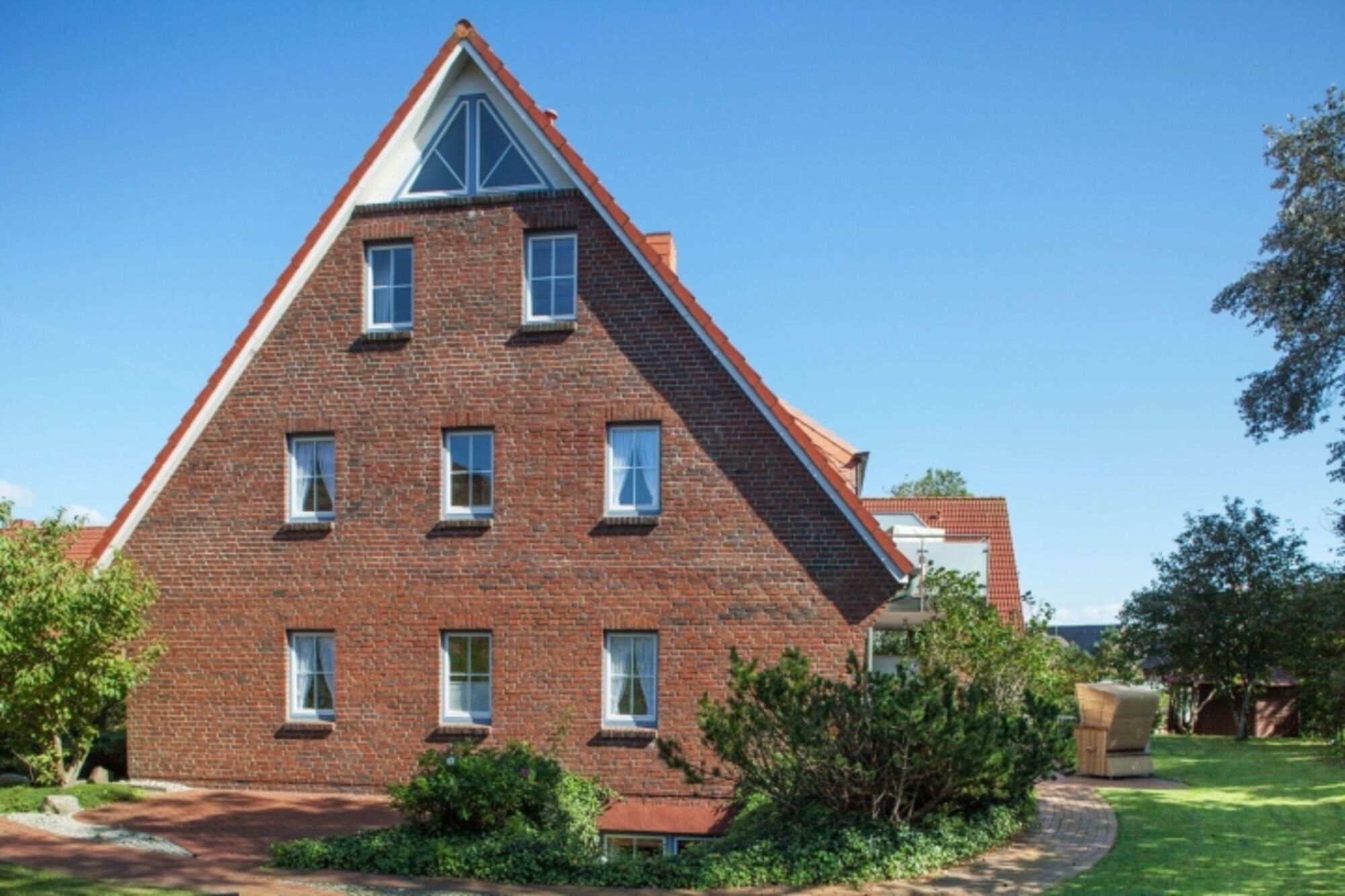 Helles Appartement mit kleiner Terrasse und Strandkorb im Erdgeschoss