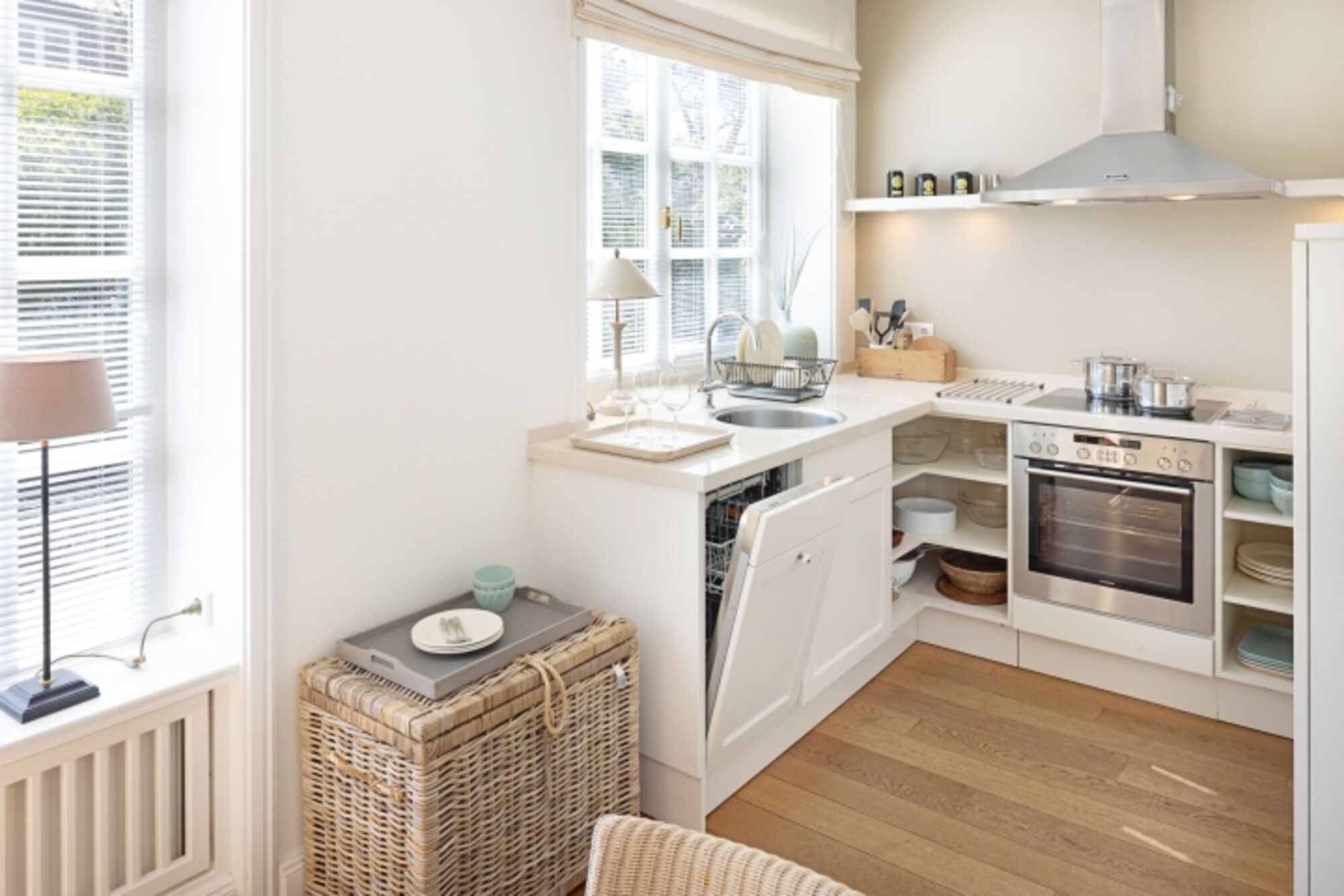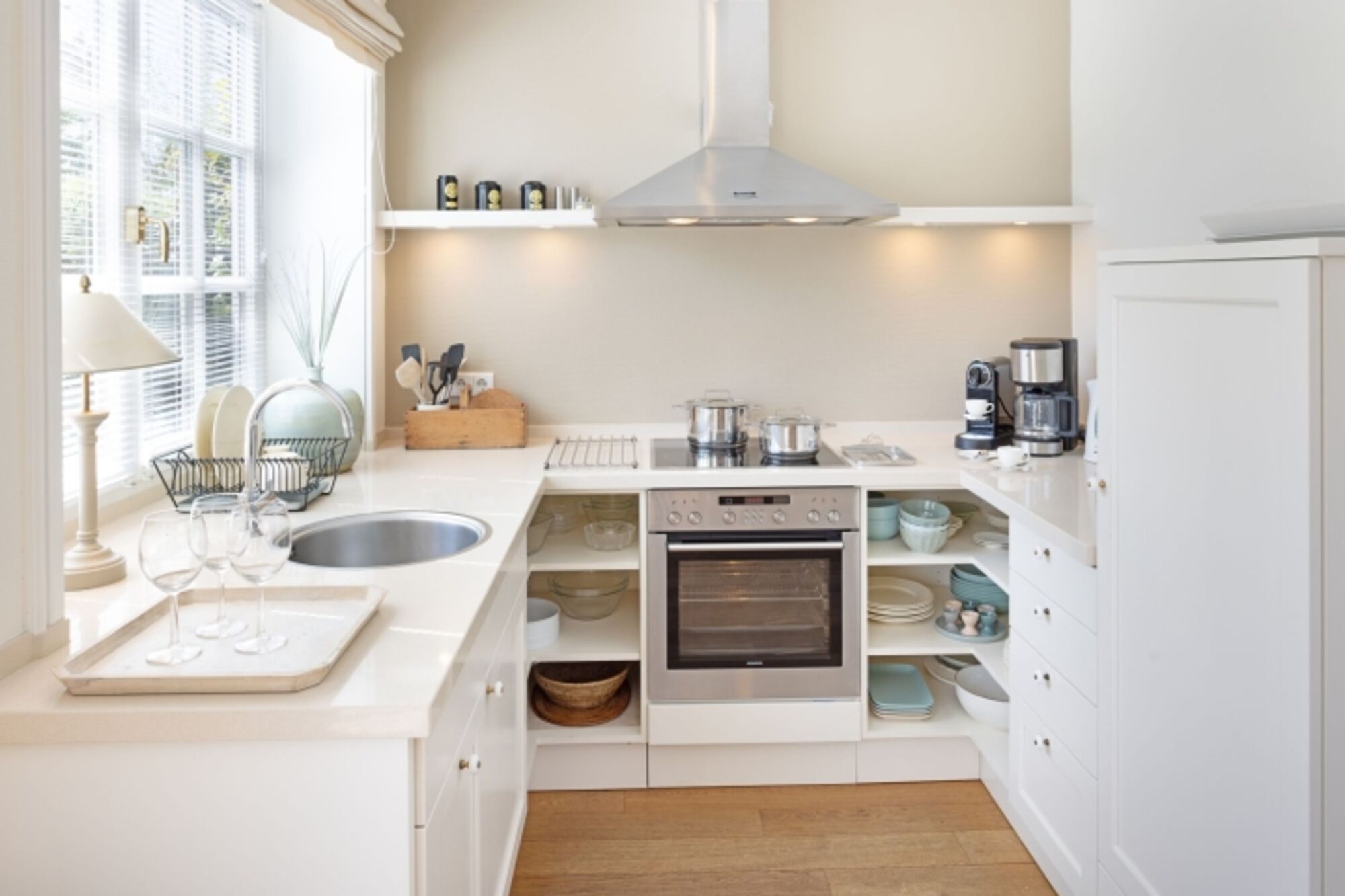 Cerankochfeld, Dunstabzugshaube, Kühlschrank mit Gefrierfach, Nespresso-Automat, Korkenzieher / Flaschenöffner, Geschirrhandtücher