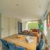Das helle Wohnzimmer im Erdgeschoss verfügt über eine große gemütliche Sitzecke und eine Essgruppe. Hinter der Schiebewand befindet sich die beleuchtete, überdachte Terrasse, wo Sie sich abends mit einem guten Glas Wein noch herrlich entspannen können.