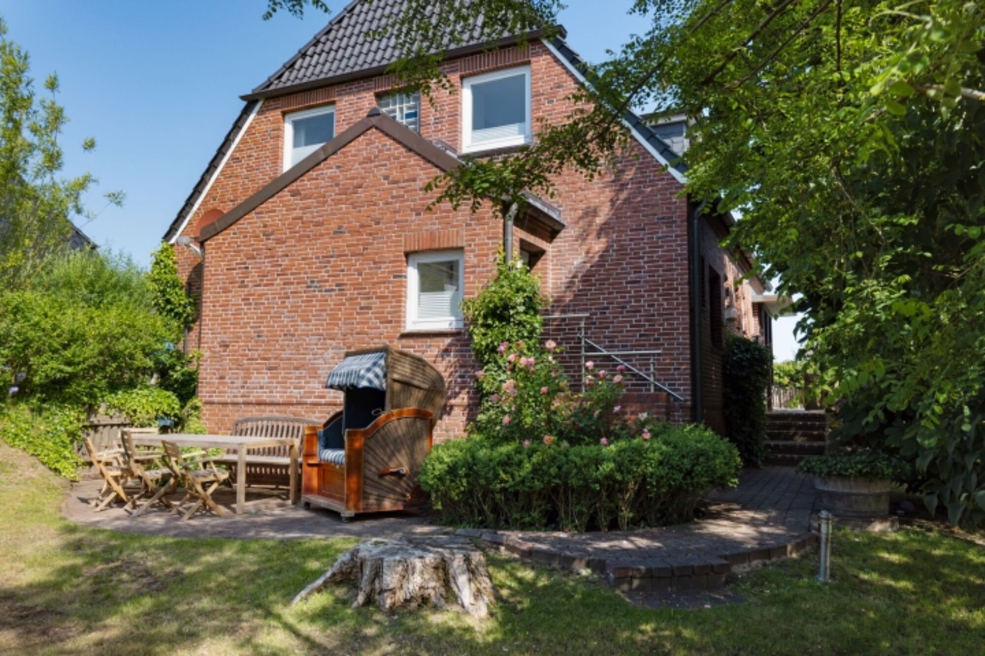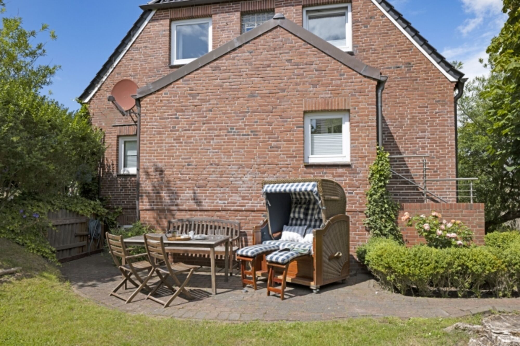 Helles Appartement mit kleiner Terrasse und Strandkorb im Erdgeschoss