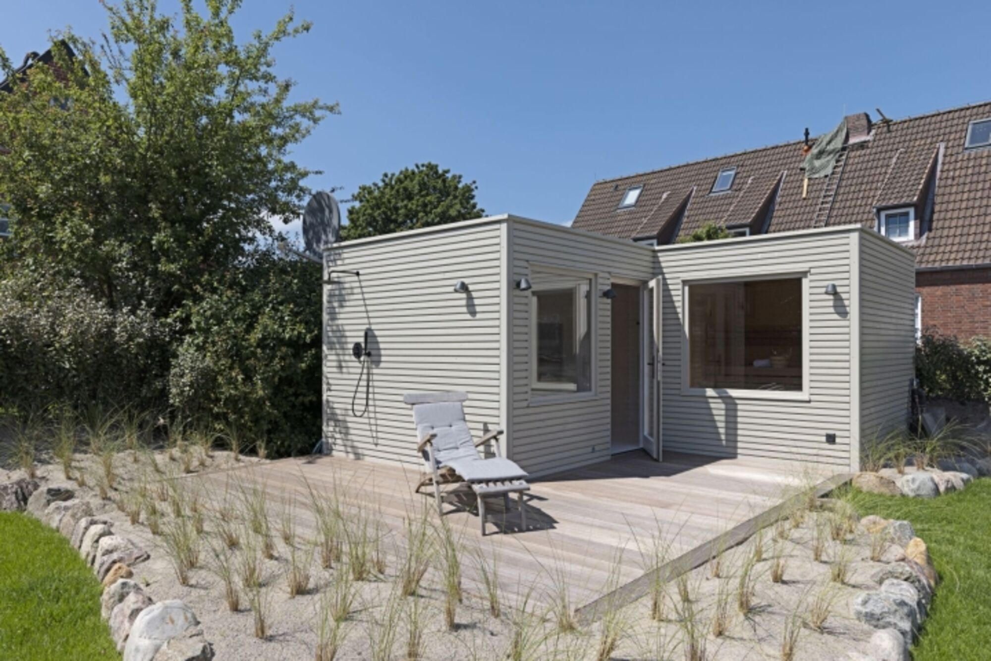 Moderne Doppelhaushälfte unter Reet mit Sauna direkt am Meer