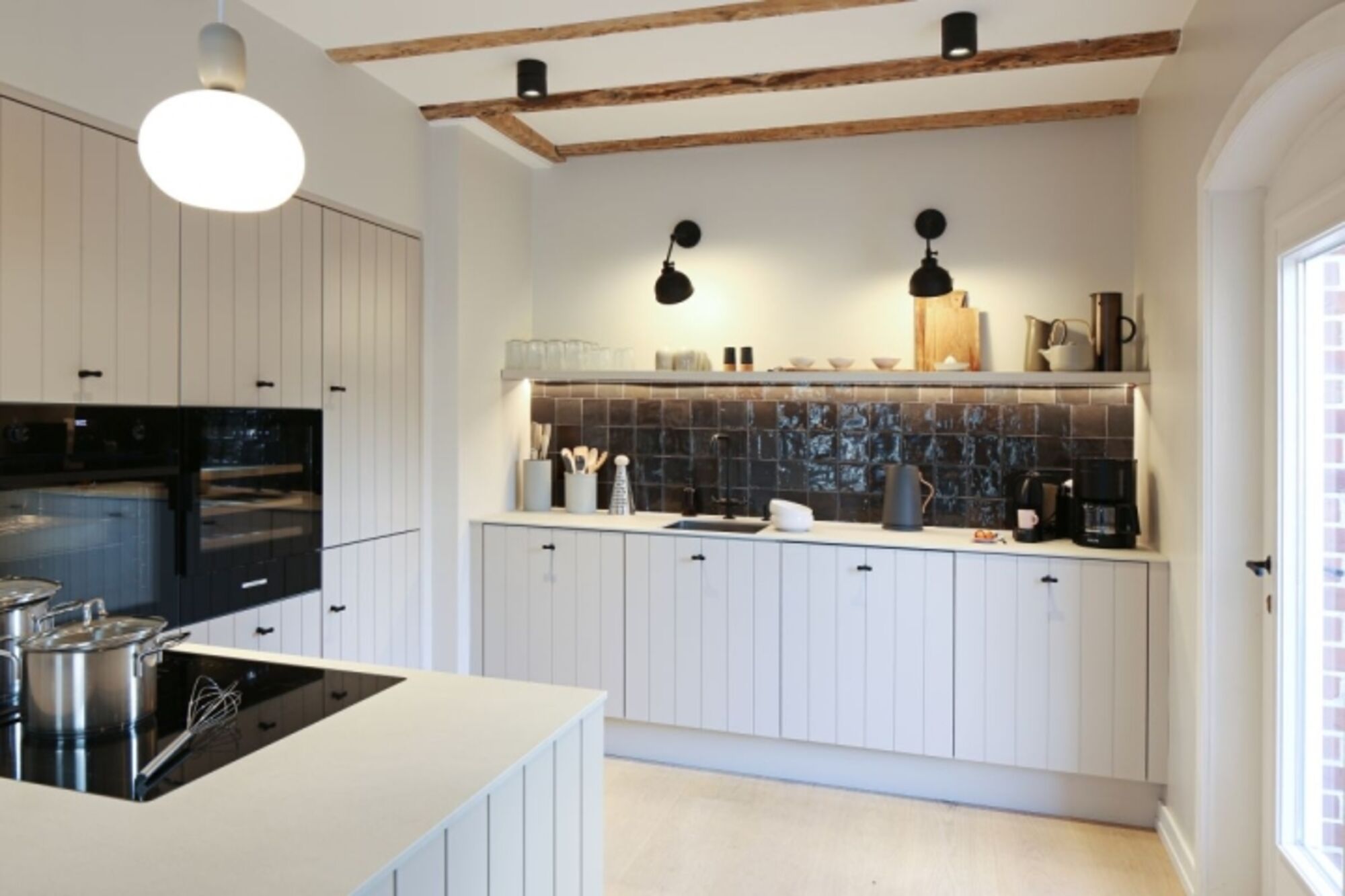Dunstabzugshaube, Kühlschrank mit Gefrierfach, Nespresso-Automat, Mixer, Korkenzieher / Flaschenöffner, Gewürze (Salz, Pfeffer, Zucker)