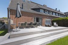 Im Außenbereich lädt ein sonniger Garten mit zwei Terrassen mit Strandkorb und Gartenmöbeln zum Relaxen ein.