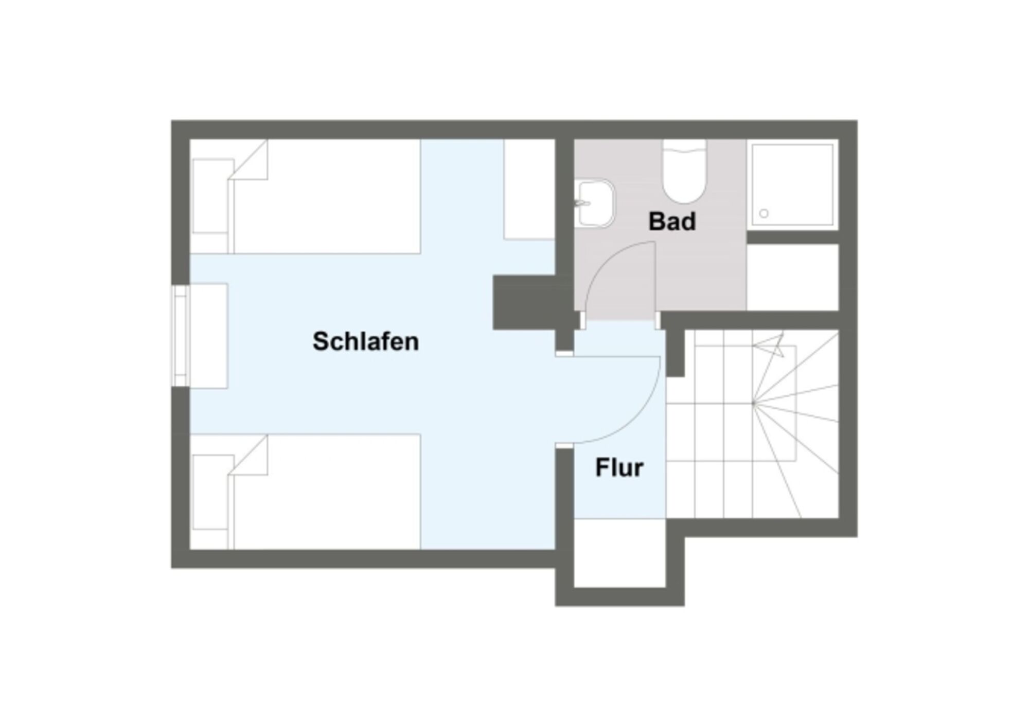 Die Schlafräume liegen in der ersten bzw. zweiten Etage (zwei mit Doppelbett, zwei mit zwei Einzelbetten).