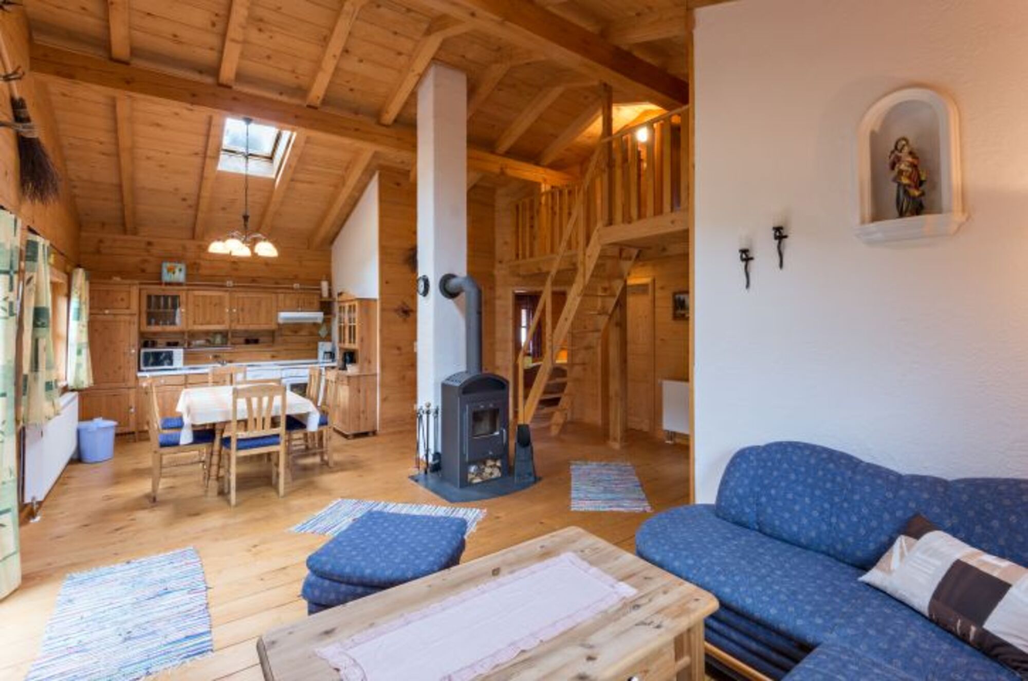 Das Holzblockhaus Riedlstein (bis 8 Pers.) verfügt über 2 Schlafzimmer mit Doppelbett im Erdgeschoss und 2 Schlafzimmer mit Doppelbett im Dachgeschoss mit einer Giebelhöhe von 1,75m.