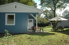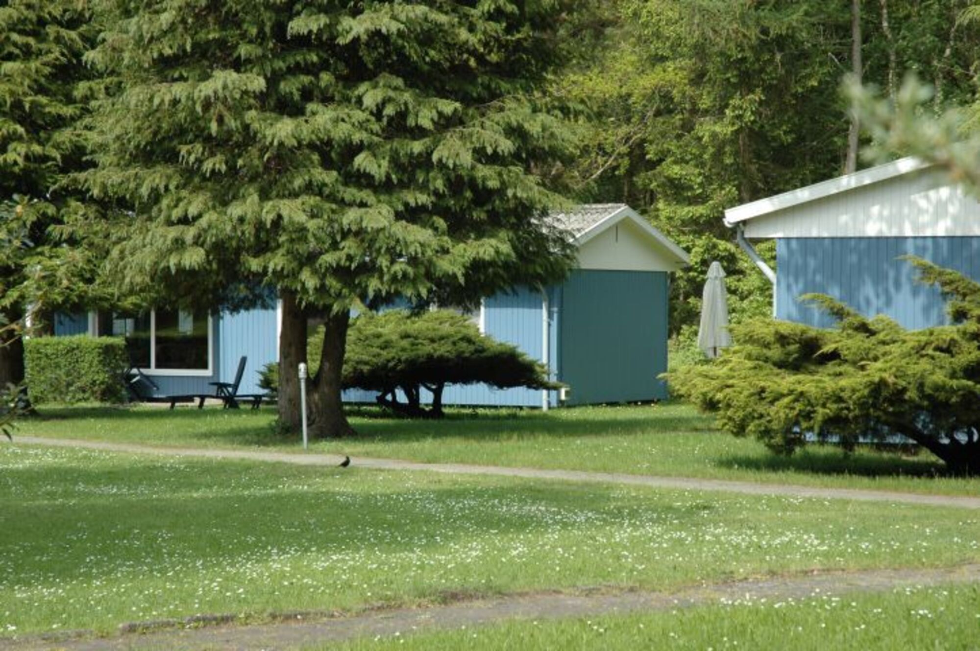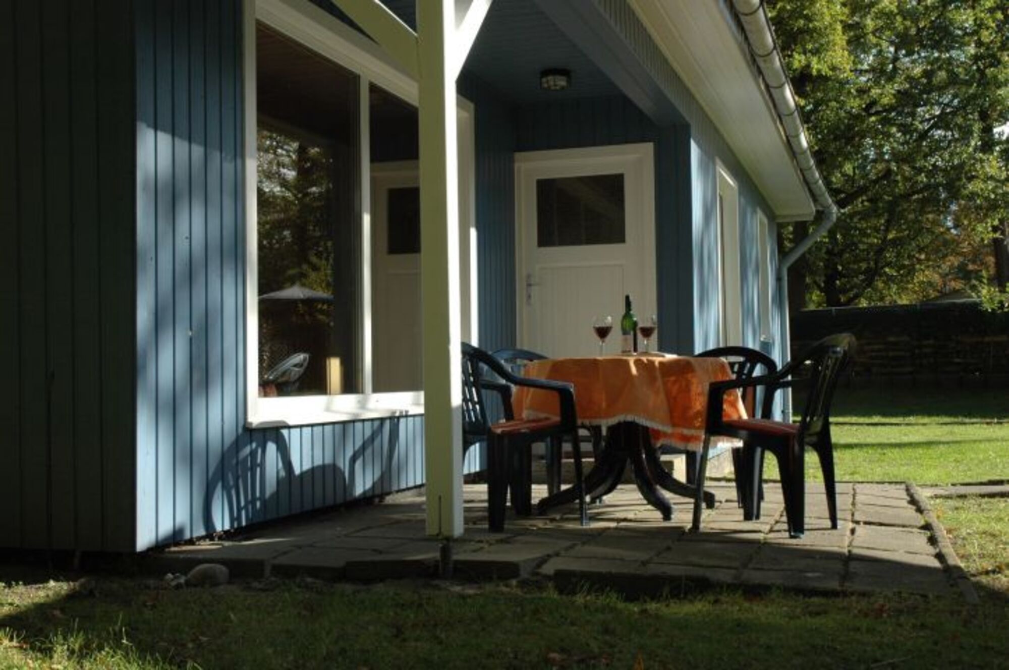 Vor dem Haus ist eine große Wiese mit Gartenmöbeln und Platz zum Grillen .