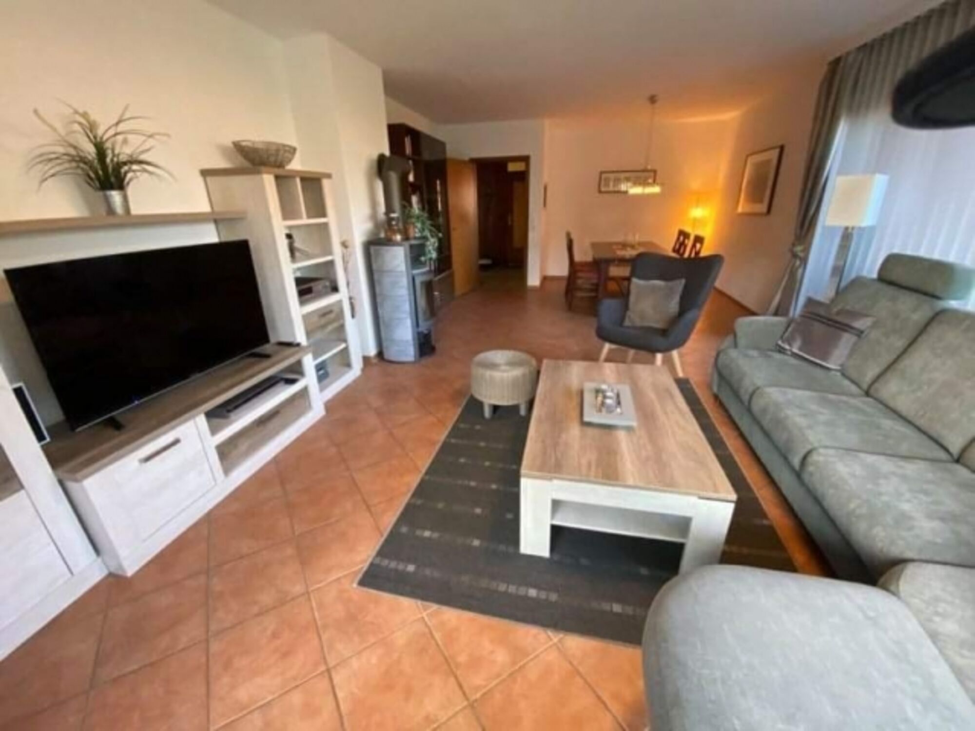 TV-Sat, SMART-TV, TV-Flachbildschirm, Bücher, Kaminofen, Eckcouch, Sessel