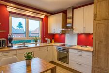 Cerankochfeld, Induktionsherd, Dunstabzugshaube, Kühlschrank mit Gefrierfach, Mixer, Korkenzieher / Flaschenöffner, Mülltüten, Essplatz in der Küche