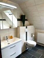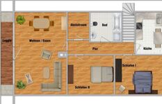 Das Ferienhaus-Wiesengrund liegt in einer ruhigen Nebenstraße am Feldrand. Die Ferienwohnung im Obergeschoss verfügt über ein großes Wohnzimmer über die gesamte Breite des Hauses mit einer großzügigen Sitzecke und einem Essbereich. Es gibt zwei Schlafzimmer mit jeweils einem Doppelbett. Die Küche ist umfangreich ausgestattet. Im voll ausgestatteten Badezimmer ist 1 Dusche, 1 Eckbadewanne, 1 Waschbecken und 1 WC vorhanden. Im Januar 2020 wurde eine finnische Sauna eingebaut. Das Gästebad verfügt über ein WC, Waschtisch und Spiegel.