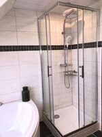 Waschbecken, Regendusche, Spiegel, Fenster im Bad