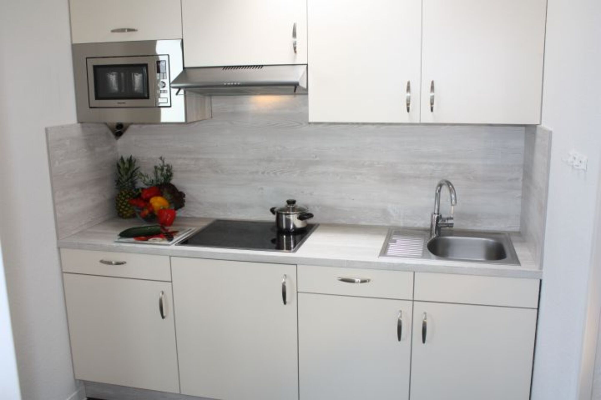 Die kleine Küchenzeile ist mit einer Mikrowelle mit Backfunktion, Kochfeld, Kühlschrank mit Gefrierfach, Kaffeemaschine sowie Kochtöpfen und Geschirr ausgestattet.