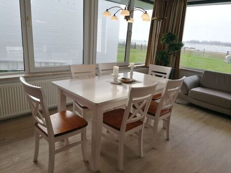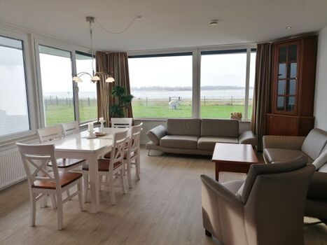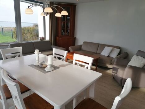 Schon vom Wohnzimmer aus hören Sie das Rauschen der Wellen und genießen durch die große Fensterfront einen herrlichen Ausblick auf das Meer und die vorbei fahrenden Schiffe.