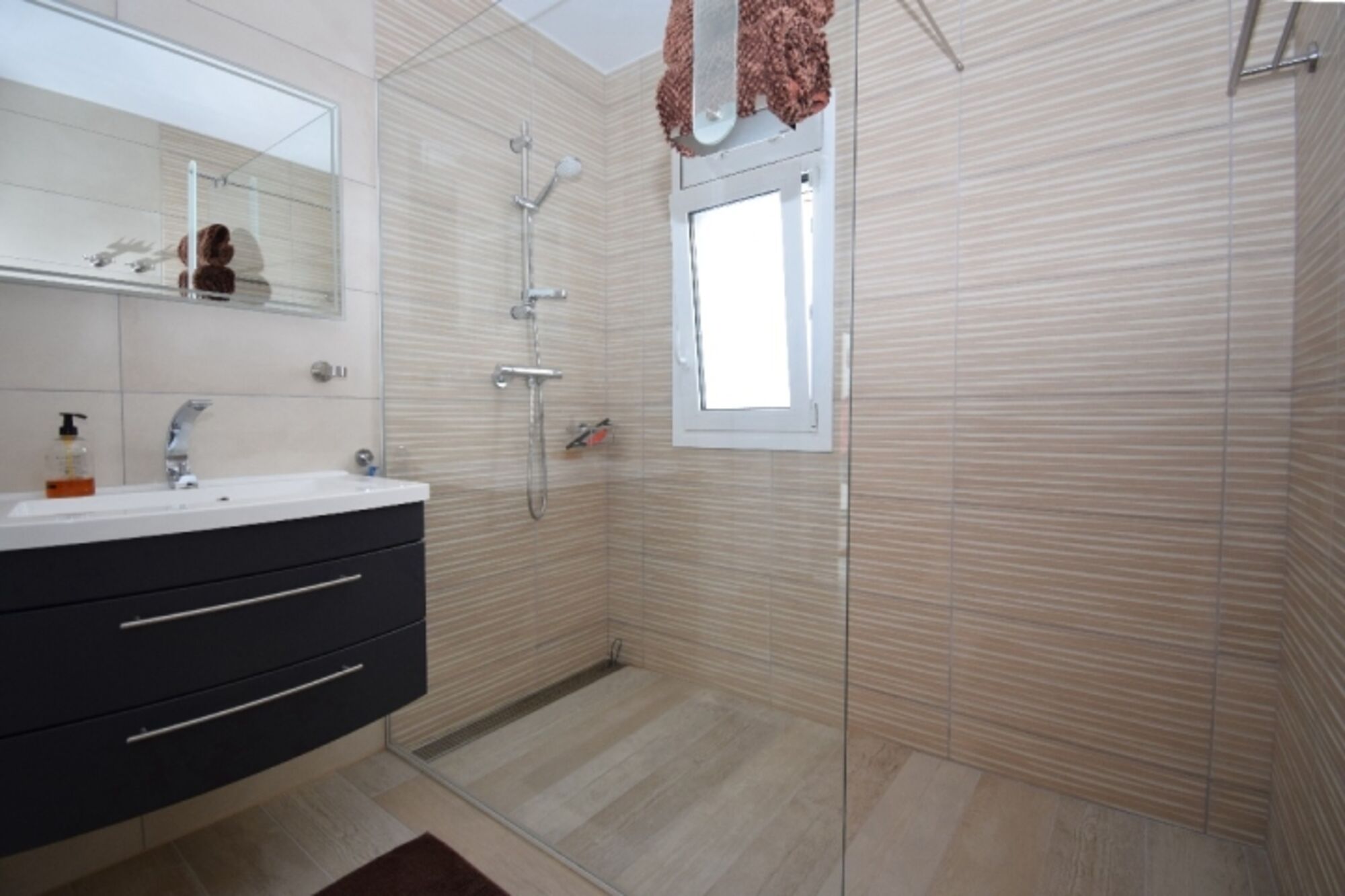 1 Badezimmer mit ebenerdiger XXL-Dusche, WC und Waschbecken, Fenster mit Fliegengittern und elektrischen Rollläden .