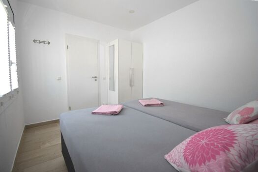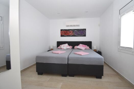 1 Schlafzimmer mit Doppelbett (2 Einzelmatratzen), Klima, Kleiderschrank, Fenster mit Fliegengittern und elektrischen Rollläden.