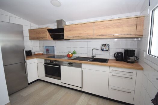 Modernste offene Einbauküche mit : Kühl-Gefrierkombination, Spülmaschine, Backofen, Cerankochfeld, Abzugshaube, Kaffeemaschine, Toaster, Wasserkocher etc.