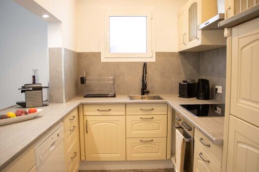 Cerankochfeld, Induktionsherd, Dunstabzugshaube, Kühlschrank mit Gefrierfach, Eierkocher, Korkenzieher / Flaschenöffner, Geschirrhandtücher