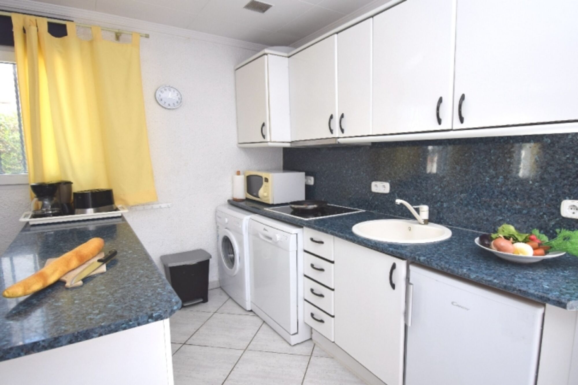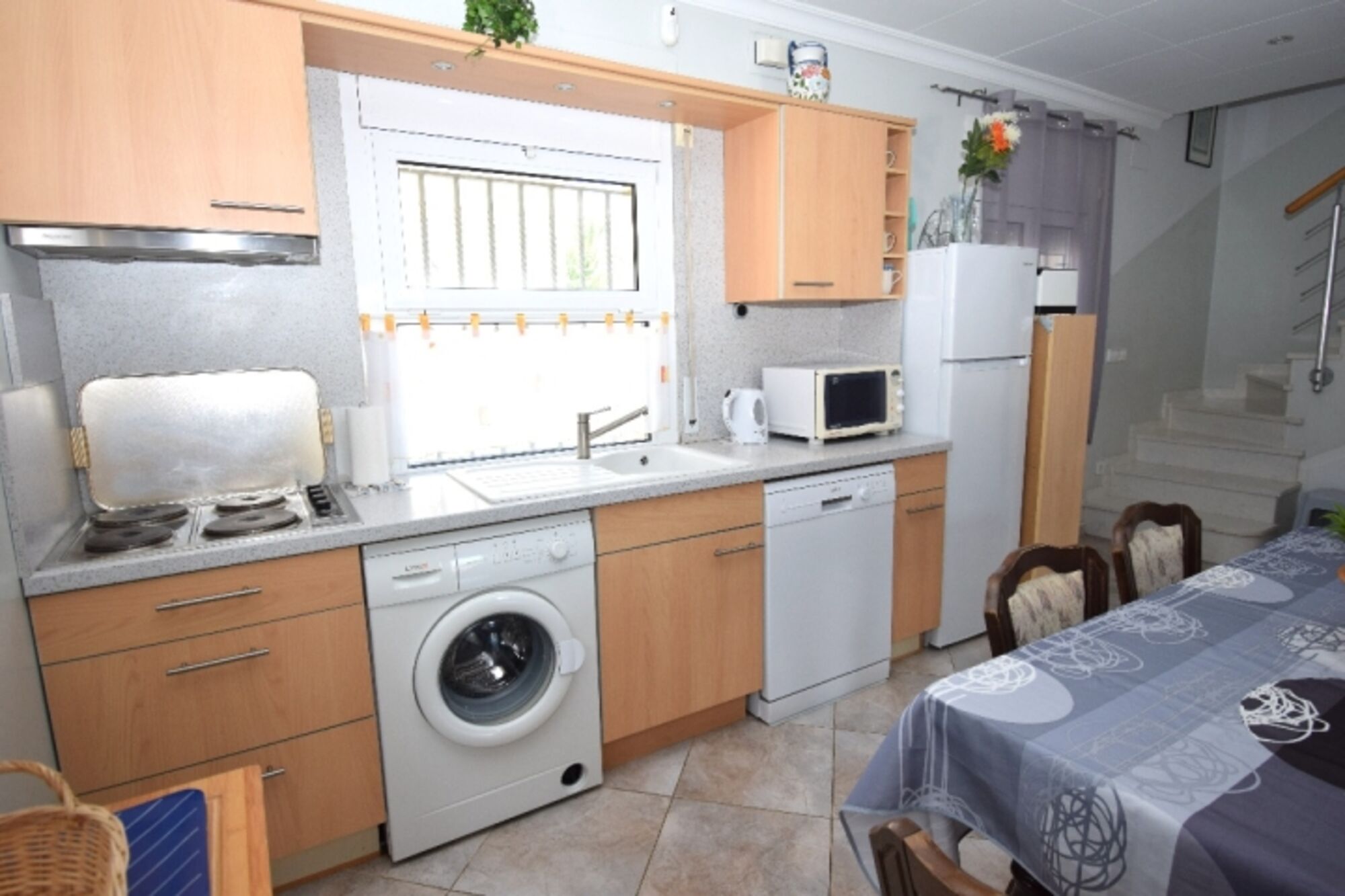 Moderne, komplett eingerichtete Einbauküche (Spülmaschine, Mikrowelle, Elektroherd mit Abzugshaube, grosse Kühl- Gefrierkombination, Waschmaschine, Kaffeemaschine, Toaster etc.)