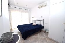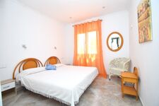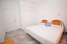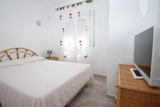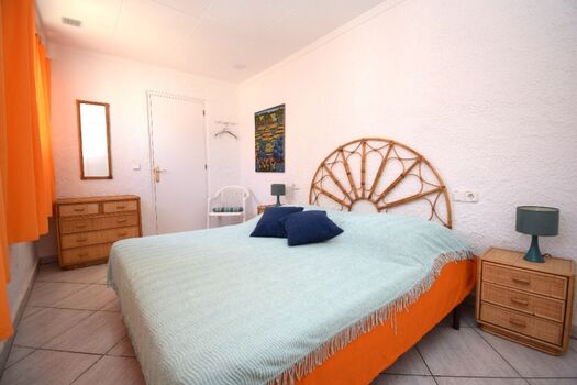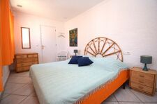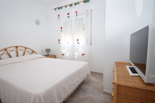 1 Schlafzimmer mit SAT-TV , Doppelbett (ca.150x190-200 cm), Einbauschrank, Blick zum Pool- u. Terrassenbereich, Fenster mit Fliegengitter.