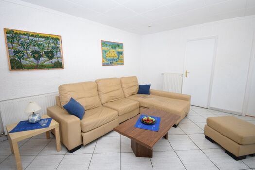 Grosses Wohn- u. Esszimmer mit Klima und SAT-TV, Eck-Leder-Couchgarnitur, Essbereich mit Tisch und Stühle.