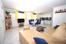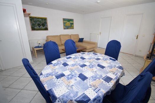Grosser, sonniger Wohnraum mit Esstisch und Stühlen, grosser Flachbild-TV (SAT-TV), Sofa und Sessel