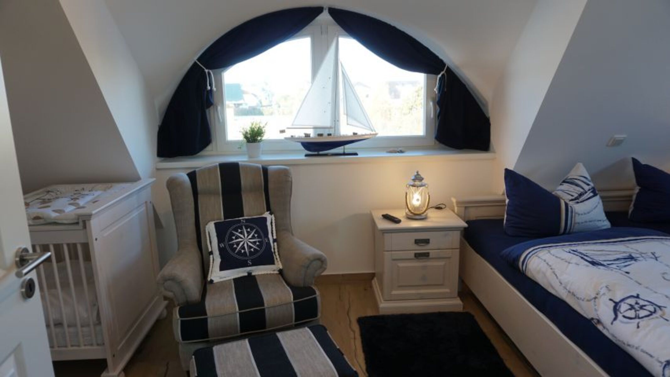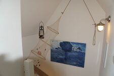 Schlafzimme "Koje mit Ausguck zum Meer" im Spitzboden Einzelbett, Kommode, Wecker, Leselampe am Bett, Fliegengitter
