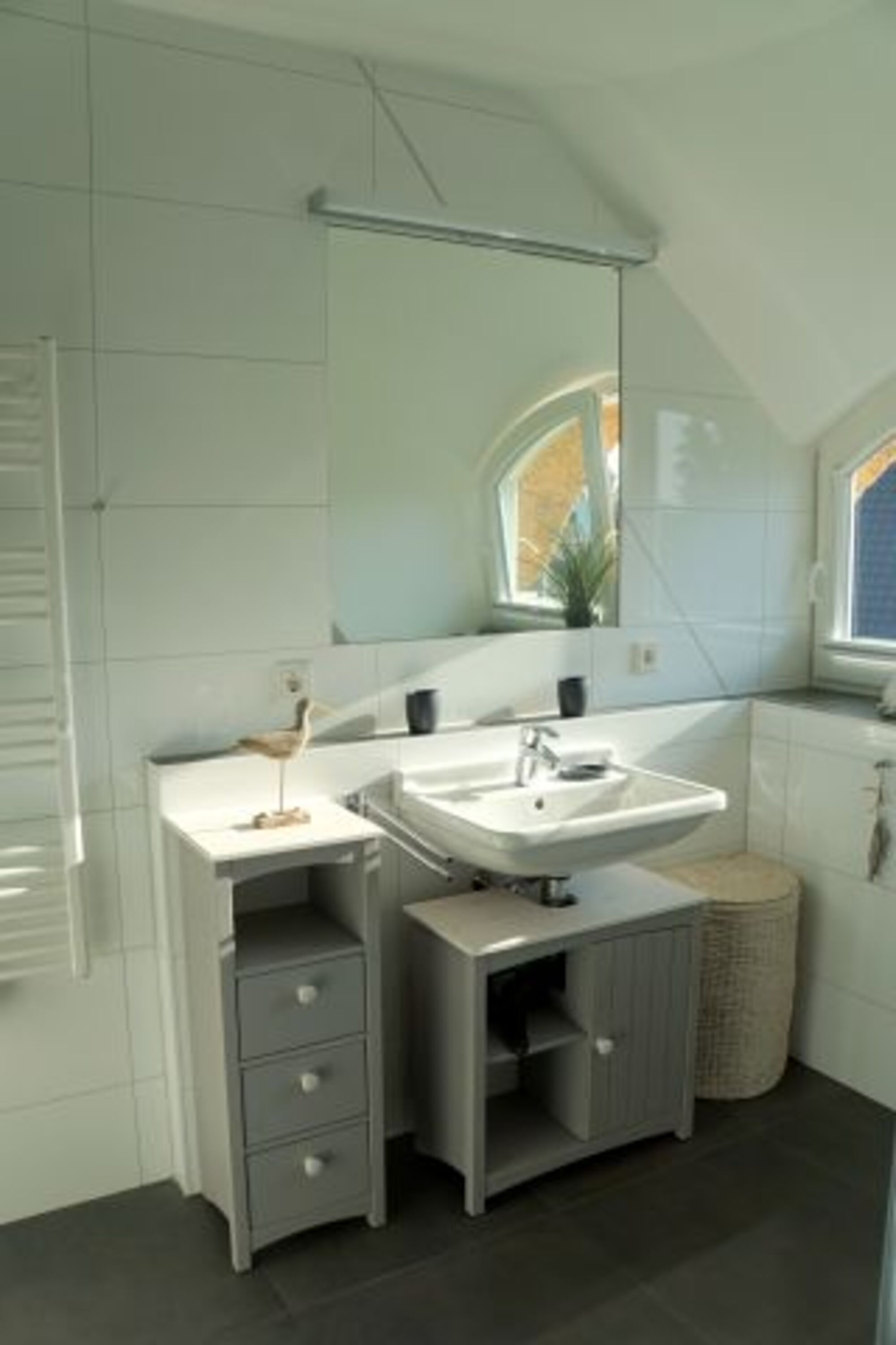 Waschbecken, Spiegel, Fenster im Bad