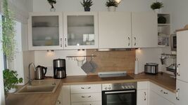 4-Platten Herd, Cerankochfeld, Dunstabzugshaube, Kühlschrank mit Gefrierfach, Tassimo-Kaffeautomat, Eierkocher, Korkenzieher / Flaschenöffner, Gewürze (Salz, Pfeffer, Zucker), Öl / Essig, Geschirrhandtücher