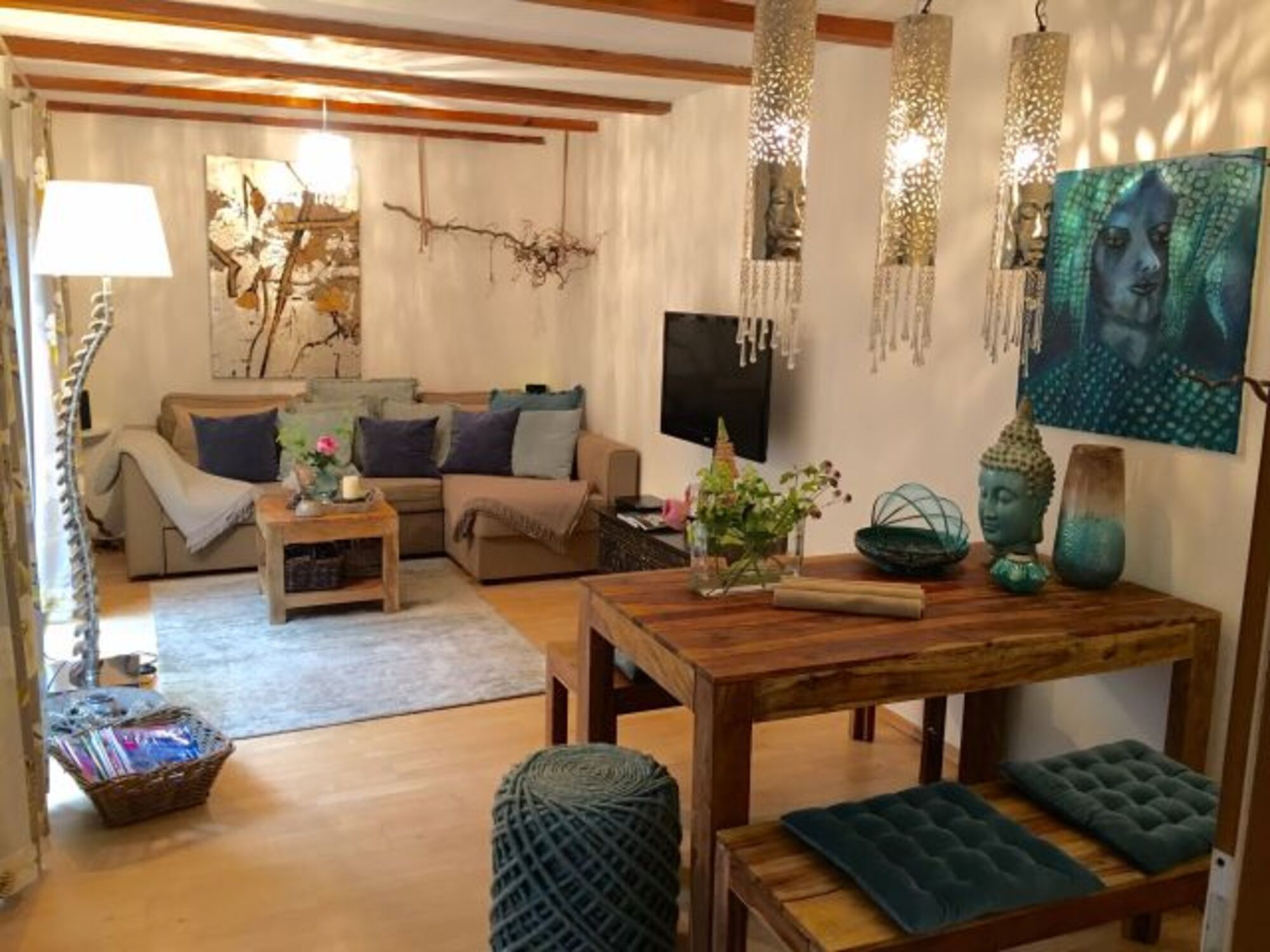 Induktionsherd, Dunstabzugshaube, Gefrierschrank, Nespresso-Automat, Mixer, Korkenzieher / Flaschenöffner, Gewürze (Salz, Pfeffer, Zucker), Öl / Essig, Geschirrhandtücher, Mülltüten, Essplatz in der Küche