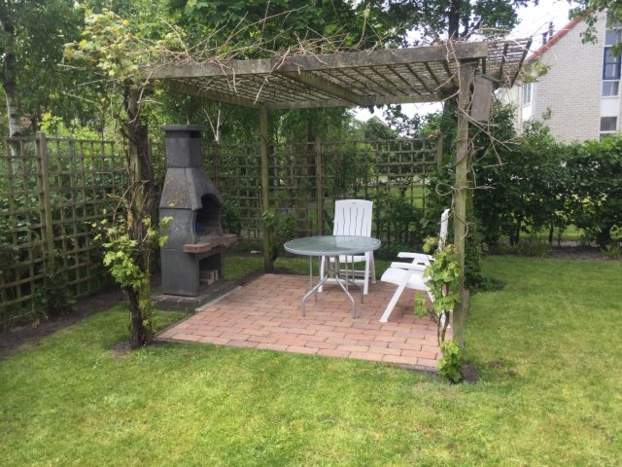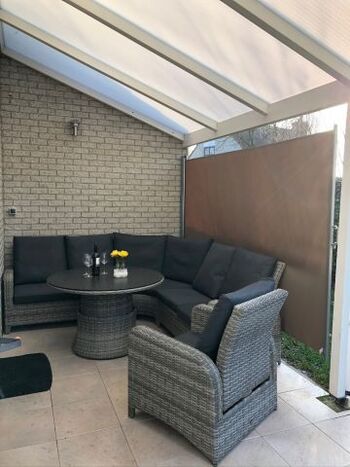 Auf dem fast 510m² großen und uneinsichtigen Grundstück befindet sich eine Sonnenterasse am Wohnzimmer mit Liegestühlen und ein windgeschützter und überdachter Essbereich am Ausgang der Küche zum Garten. Dort haben wir neue Chillout Möbel aufgestellt.